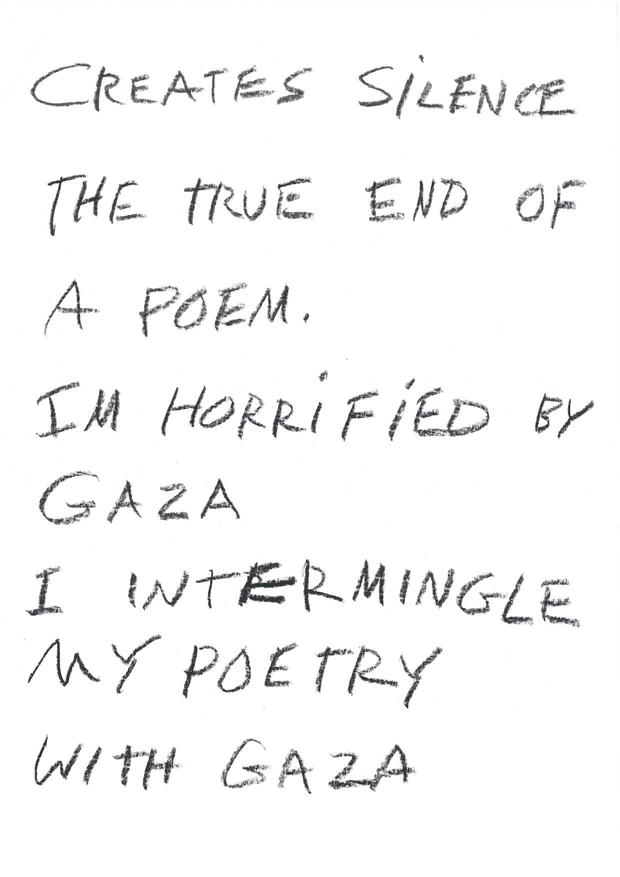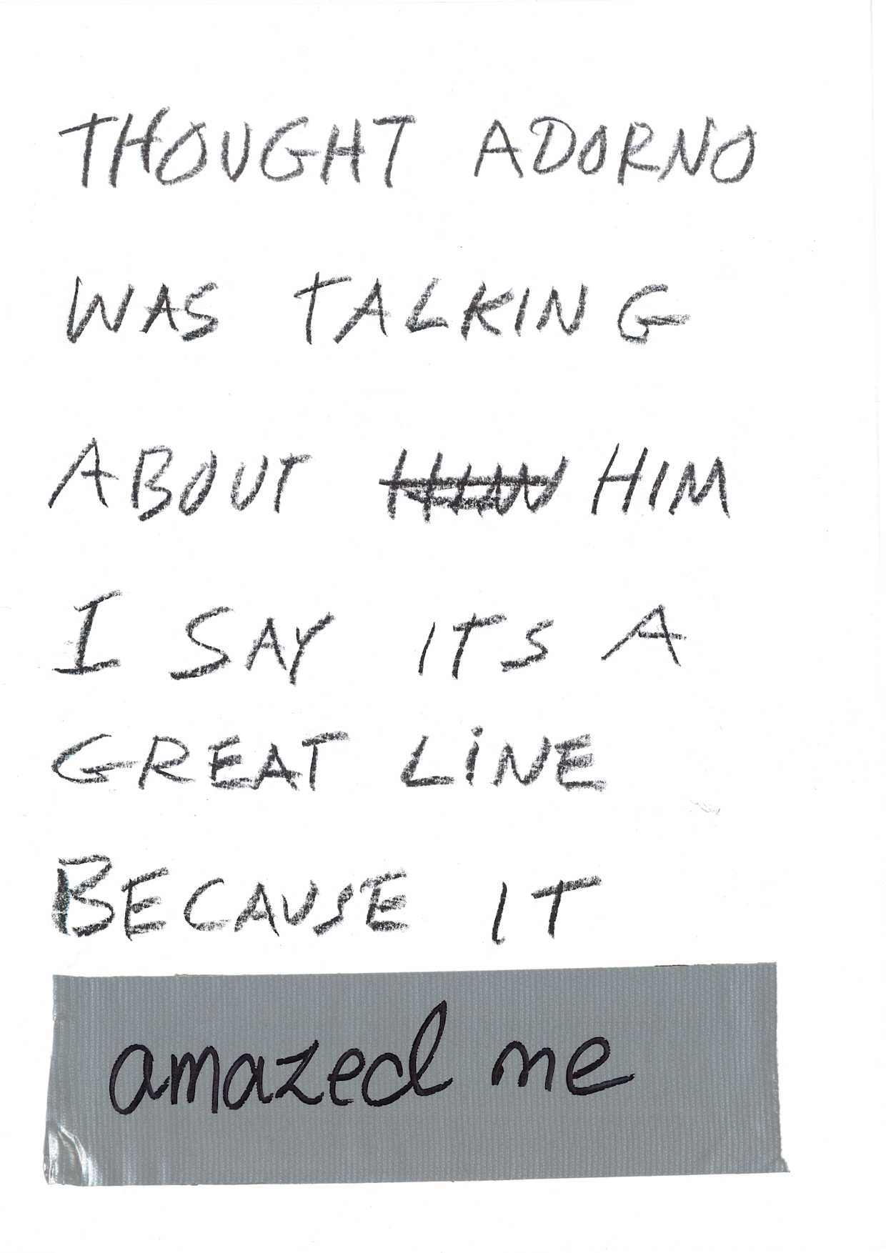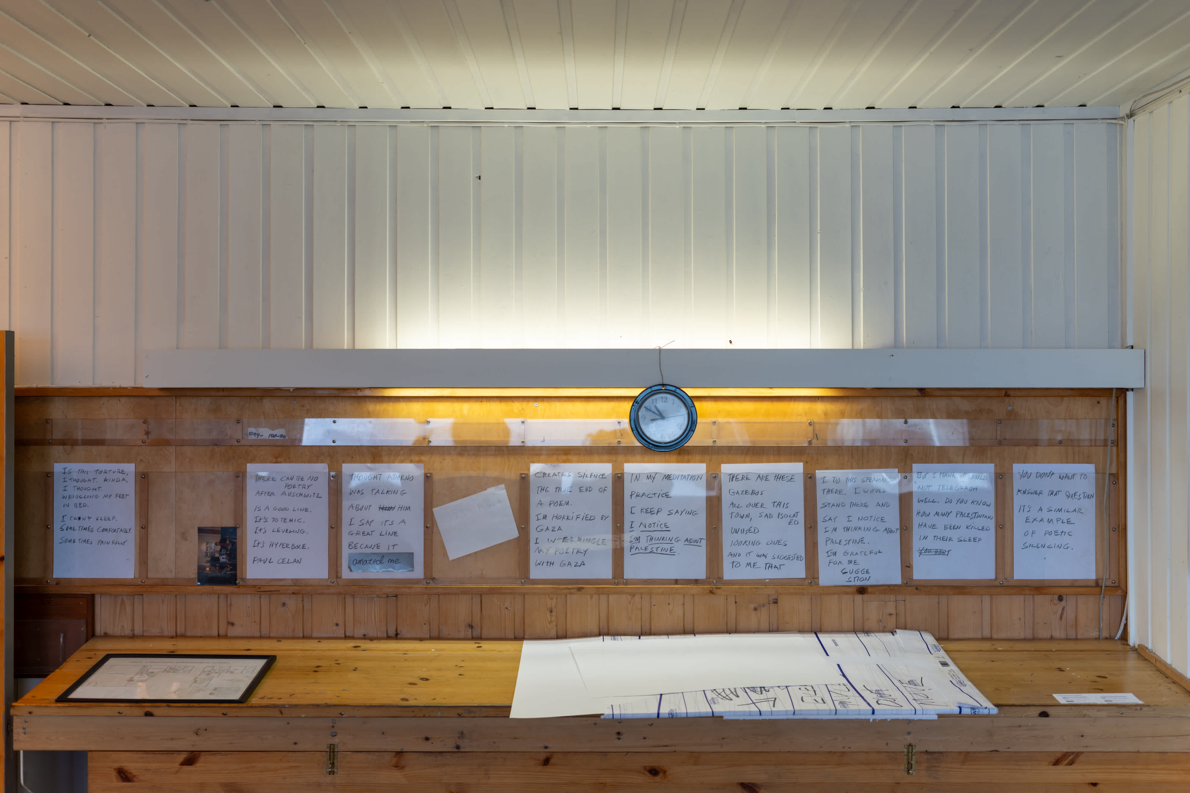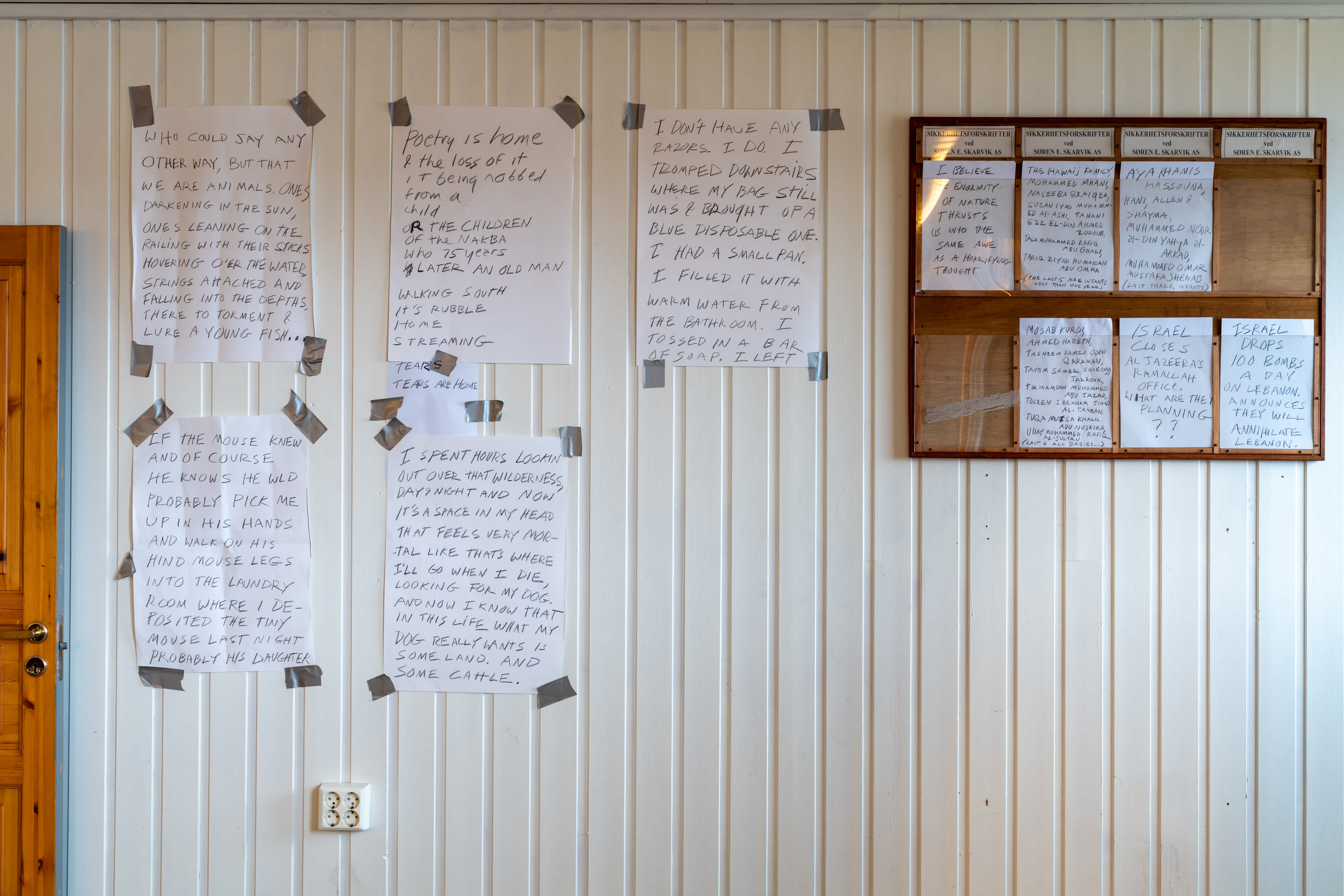 These sheets are a calendar of the days I spent at Lofoten. Which is now a bumper sticker on my truck in Texas. When I was initially invited Kjersti Solbakken encouraged me to do some kind of installation and since I was the only “non-visual” artist in the festival it seemed I should also be present. And of course there’s no such thing as non-visual. Right? So I did my official reading one day but based on the photographs Kjersti had sent of the various spaces I could occupy I chose this one - that I forget – no thank god for Instagram the space was called gangen which sounds like it just means hall. I gave mini readings in gangen like 10 minutes each day from my novel in progress and also just kind of daily poem things about the genocide in the middle east and a poet’s relation to that I guess in history and I posted a bit of these things on the wall in these nice plexi slots that somehow reminded me of Canal Street. One day no one came to the mini reading and I wondered if I should read aloud anyhow but I didn’t couldn’t. It felt too hollow.