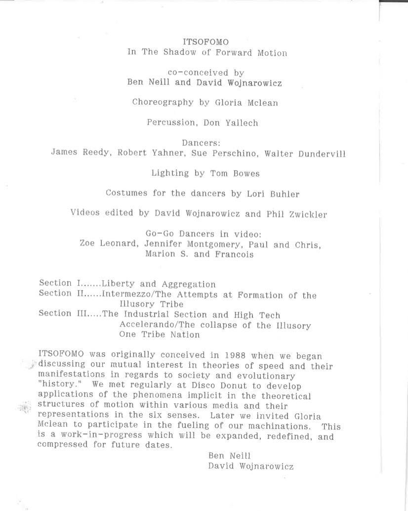 (16) Noted in the credits and introductory page from the program for ITSOFOMO (In The Shadow of Forward Motion) at The Kitchen, December, 1989.