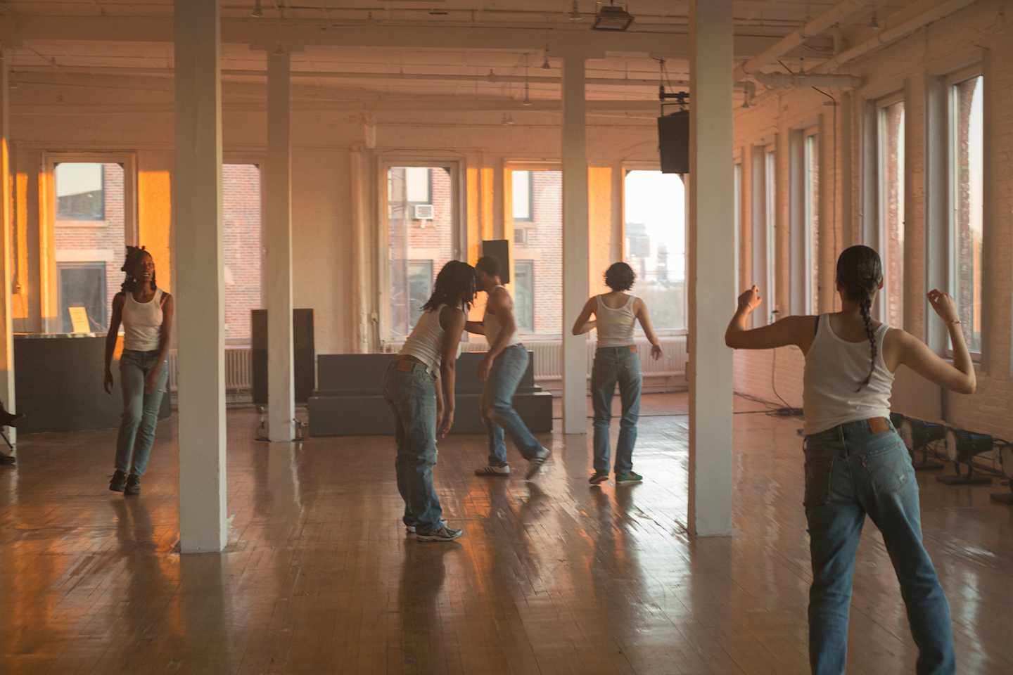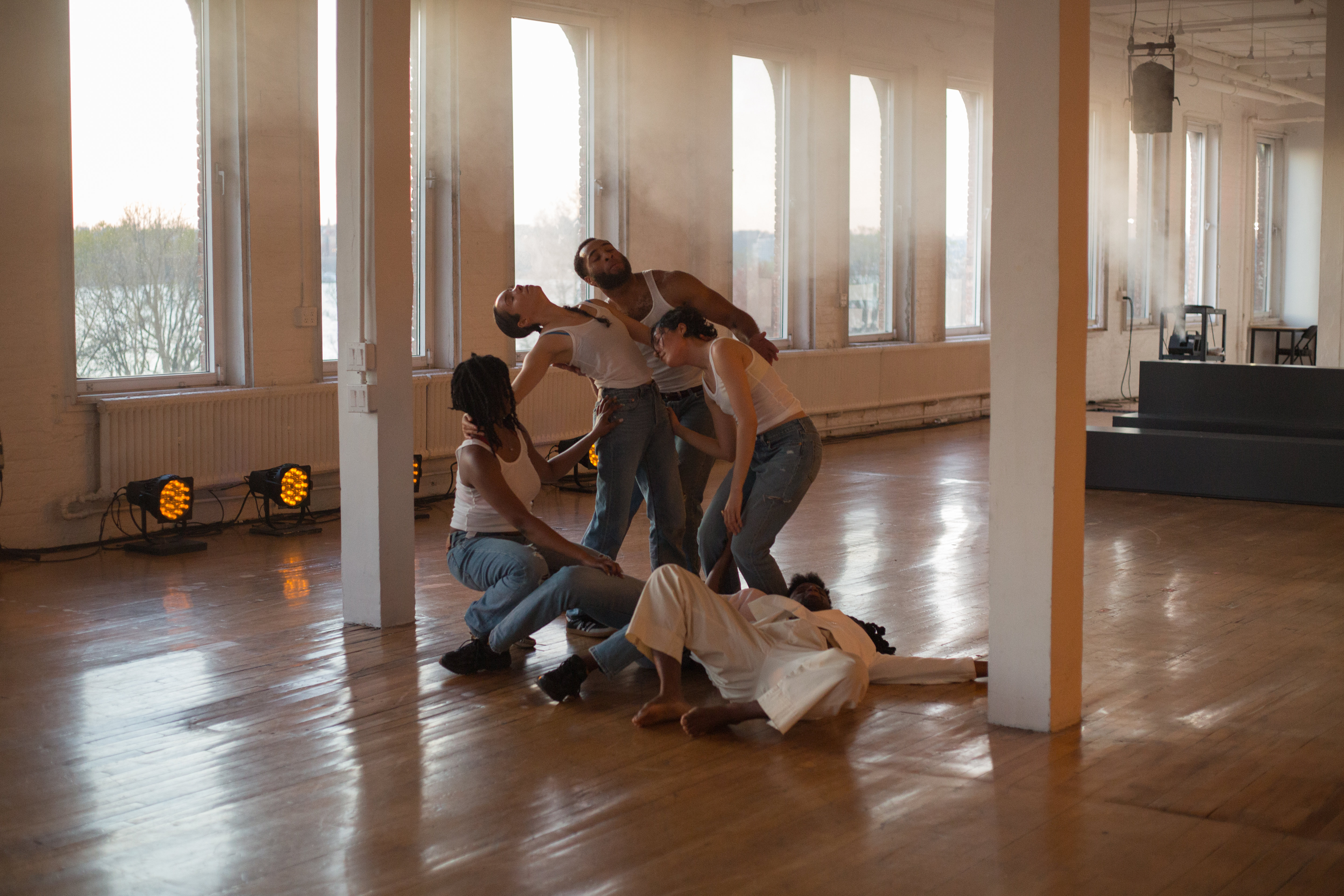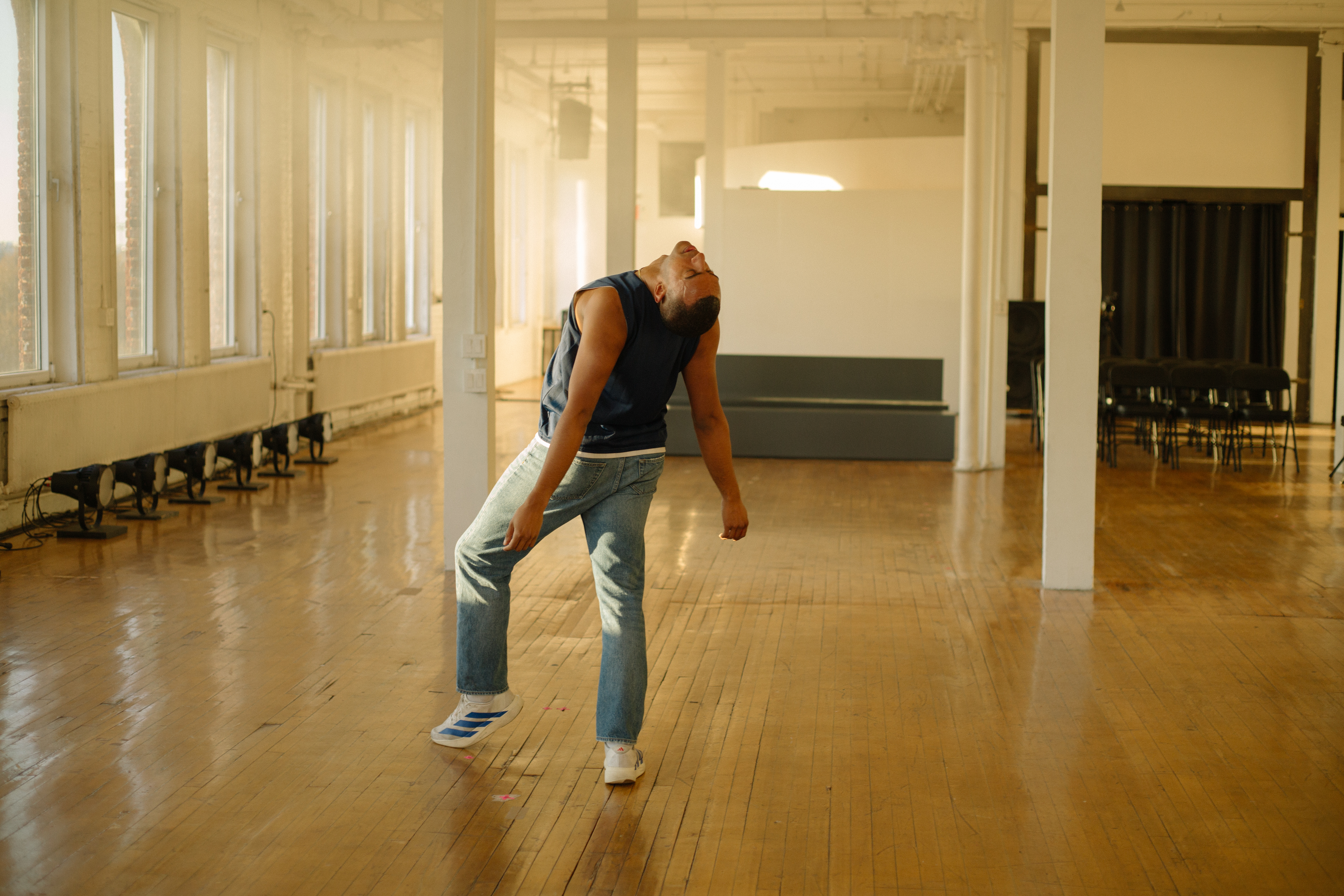 ARS: there is this recurring provocation of the feeling or space “ between life and death “ in your staging of swerve fatigue here , provoked by the intensifying theatrical ecology you’ve set into the dramaturgy of the work : lighting , sound and voice , atmosphere , touch . the way light moves between the hour of 7p and 8p in the loft is so dramatic , and you’ve arranged these frequencies distinctly into it , turning the space into what feels like this sort of infernal heaven . distinctions between dusk ≠ sunrise collapse , the columns turn into these angelic pillar points , the perspective of the room is so unsettled that foreground / background become ubiquitous , heat and haze and sweat combine and fill the air , the two subwoofers immerse us in pressure , the registers of touch are expanded and prolonged .