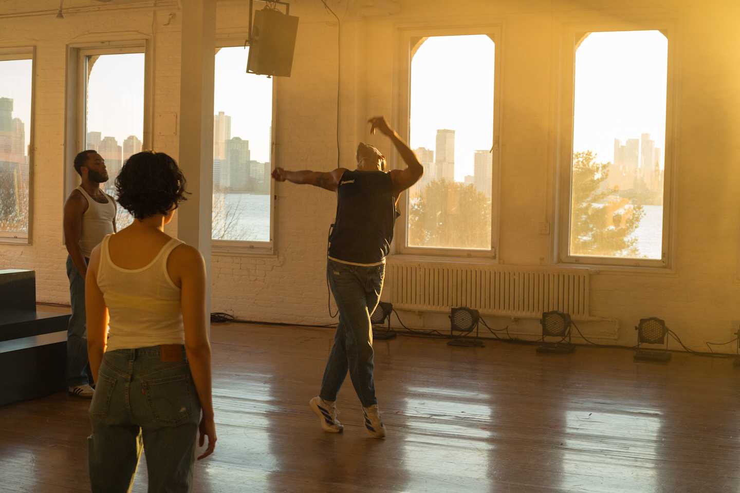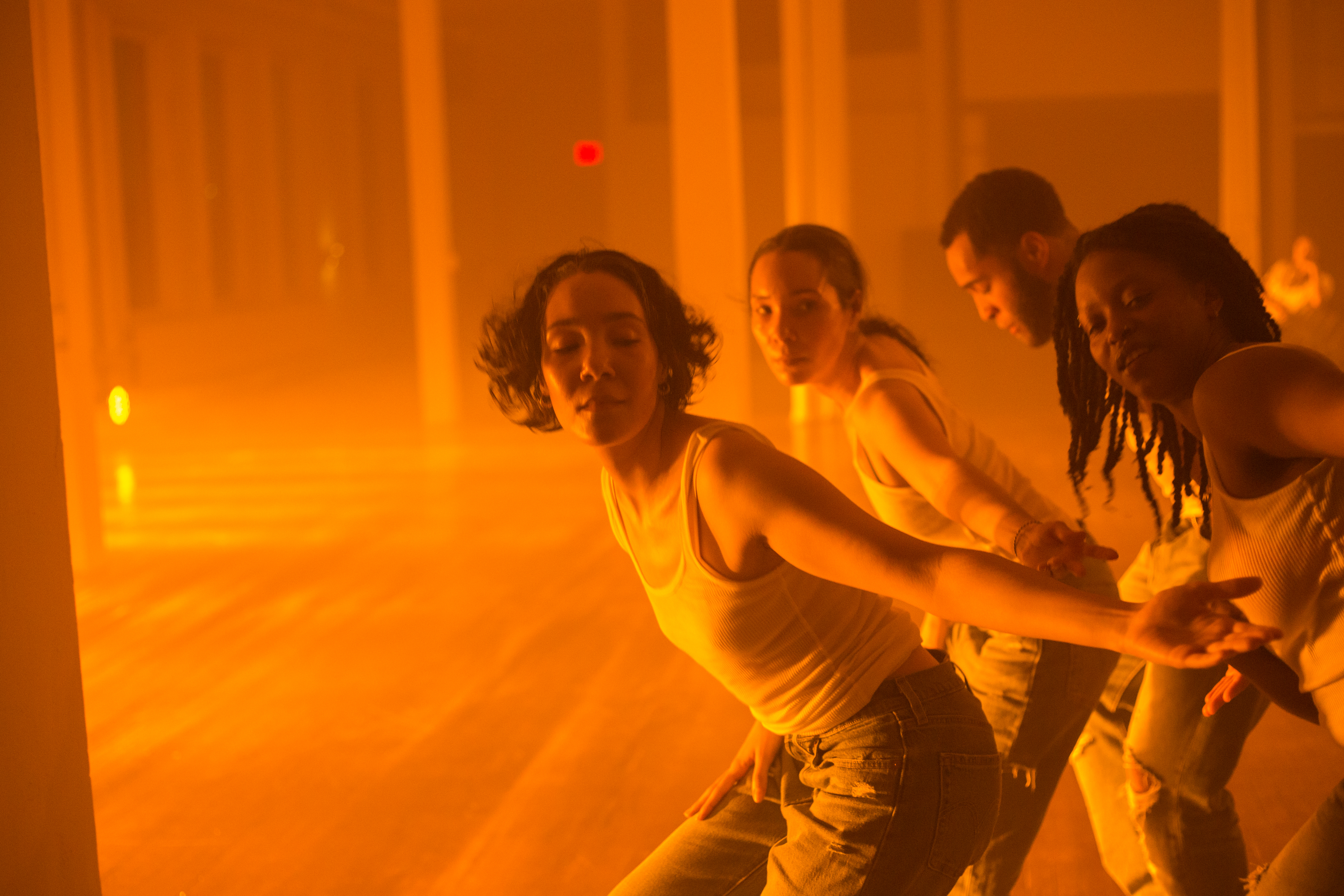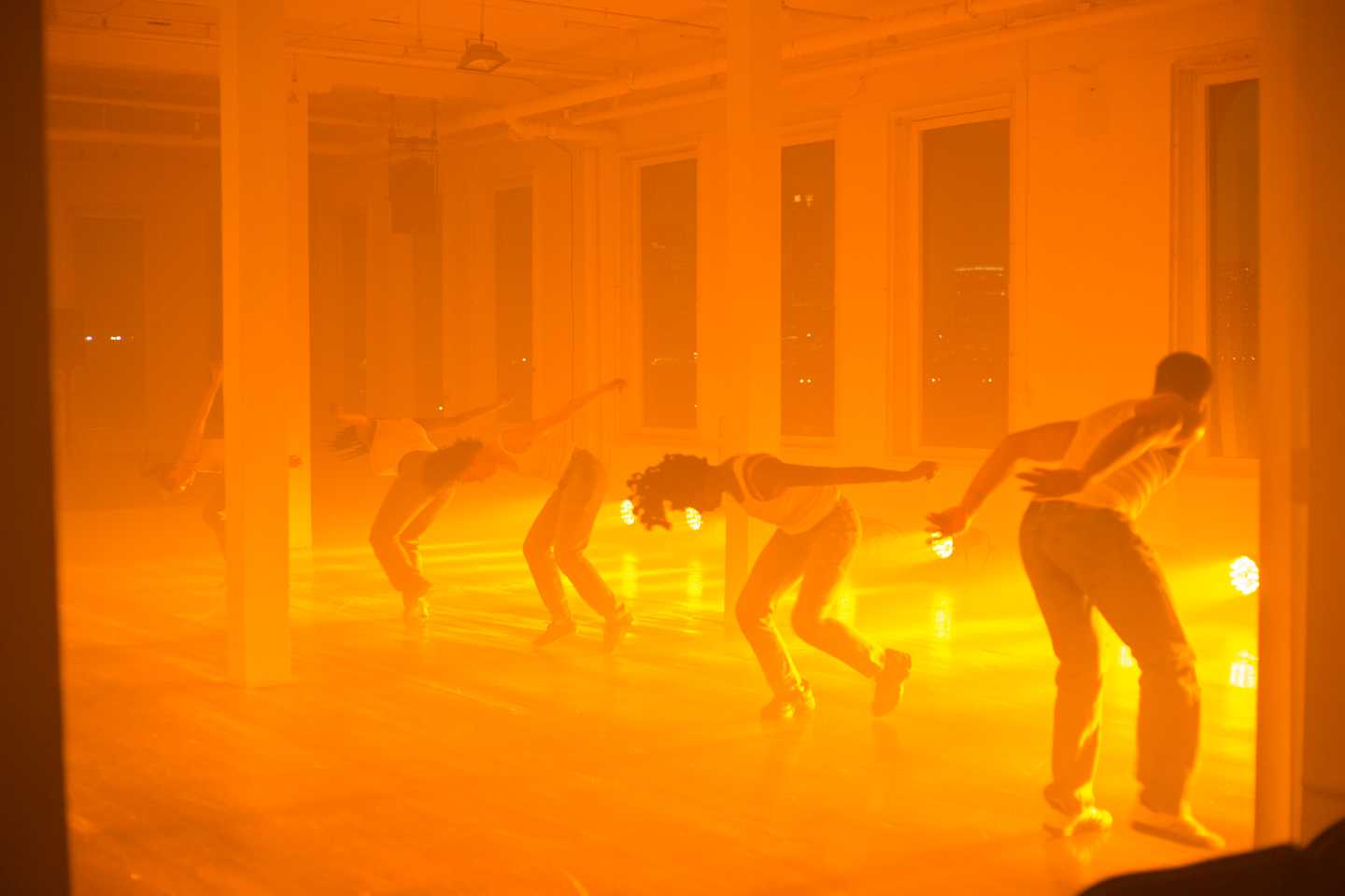 ARS: there is this recurring provocation of the feeling or space “ between life and death “ in your staging of swerve fatigue here , provoked by the intensifying theatrical ecology you’ve set into the dramaturgy of the work : lighting , sound and voice , atmosphere , touch . the way light moves between the hour of 7p and 8p in the loft is so dramatic , and you’ve arranged these frequencies distinctly into it , turning the space into what feels like this sort of infernal heaven . distinctions between dusk ≠ sunrise collapse , the columns turn into these angelic pillar points , the perspective of the room is so unsettled that foreground / background become ubiquitous , heat and haze and sweat combine and fill the air , the two subwoofers immerse us in pressure , the registers of touch are expanded and prolonged .
