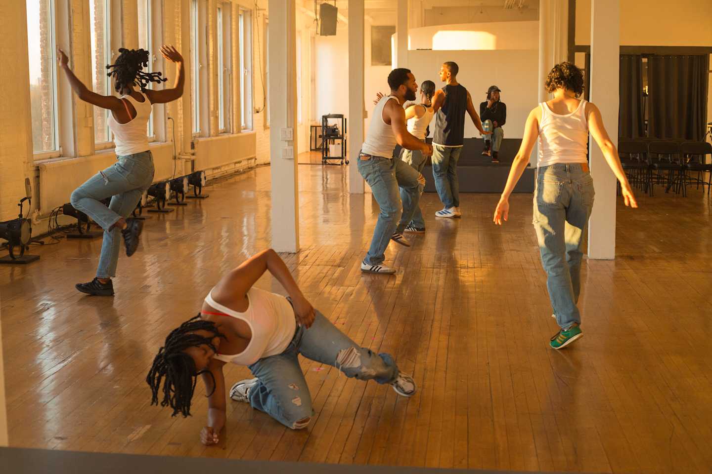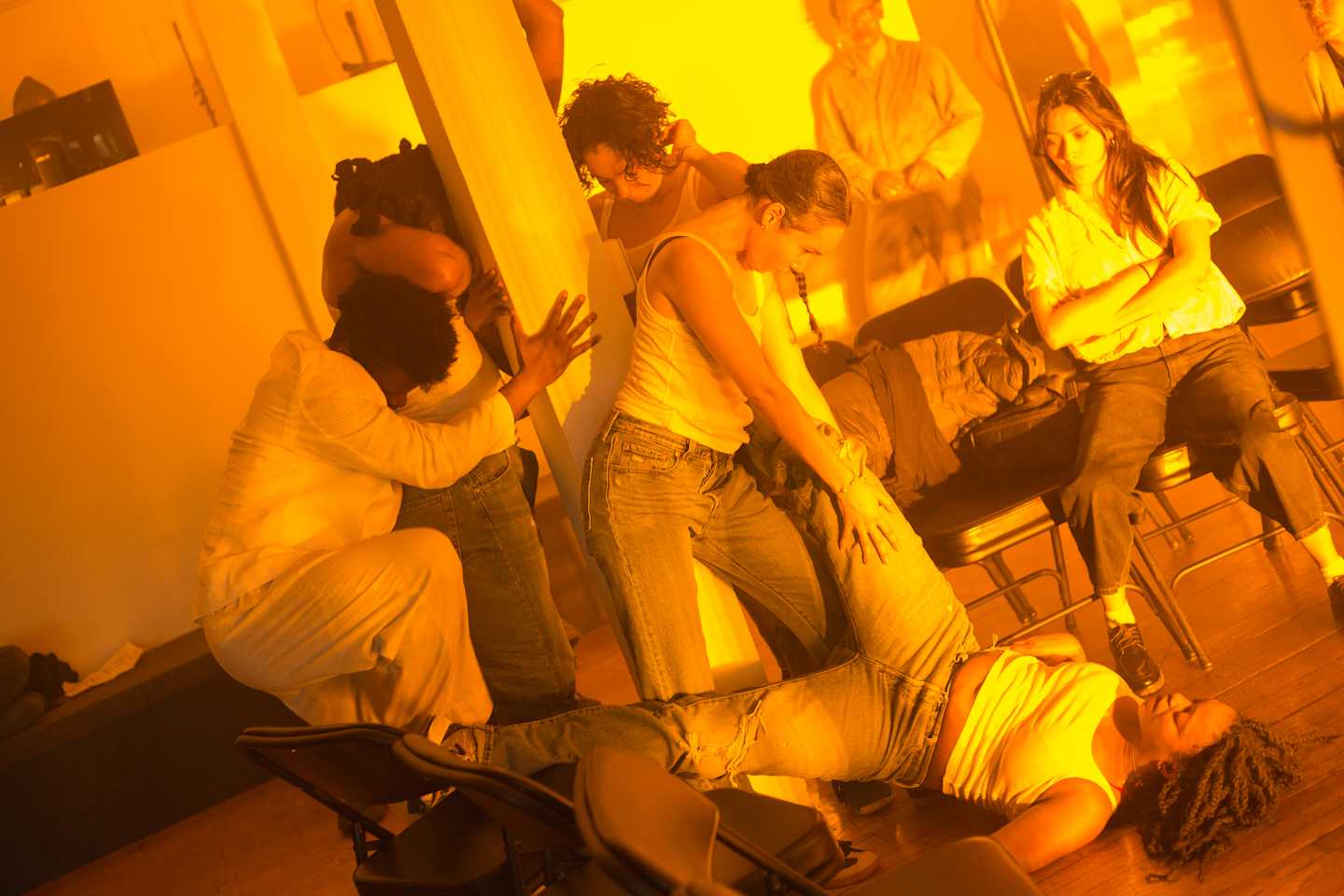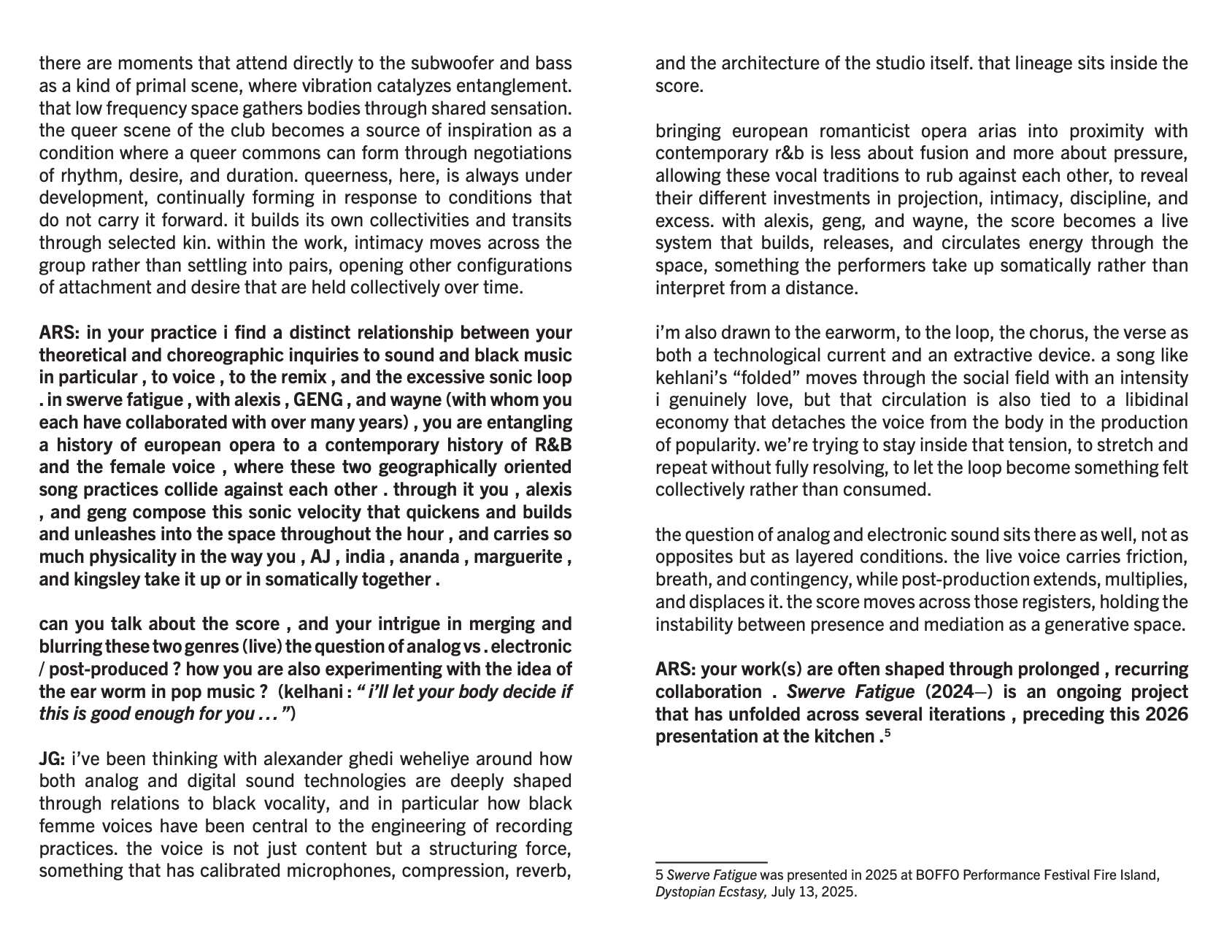 ARS: in your practice i find a distinct relationship between your theoretical and choreographic inquiries to sound and black music in particular , to voice , to the remix , and the excessive sonic loop . in swerve fatigue , with alexis , GENG , and wayne ( with whom you each have collaborated with over many years ) , you are entangling a history of european opera to a contemporary history of R&B and the female voice , where these two geographically oriented song practices collide against each other . through it you , alexis , and geng compose this sonic velocity that quickens and builds and unleashes into the space throughout the hour , and carries so much physicality in the way you , AJ , india , ananda , marguerite , and kingsley take it up or in somatically together .
