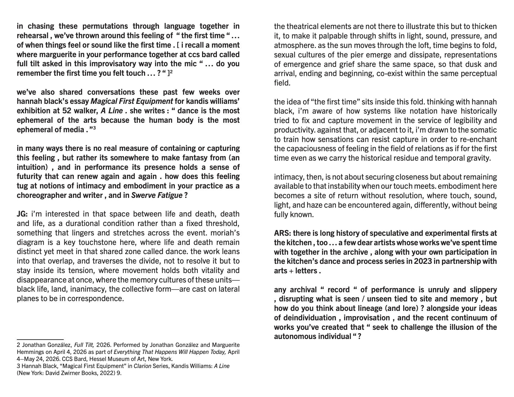 in chasing these permutations through language together in rehearsal , we’ve thrown around this feeling of “ the first time “ … of when things feel or sound like the first time . [ i recall a moment where marguerite in your performance together at ccs bard called full tilt asked in this improvisatory way into the mic “ … do you remember the first time you felt touch … ? “ ] [2] we’ve shared conversations these past few weeks over hannah black’s essay magical first equipment for kandis williams’s exhibition at 52 walker, A Line. she writes : “ dance is the most ephemeral of the arts because the human body is the most ephemeral of media . “ [3]