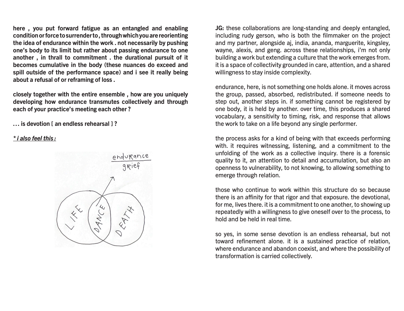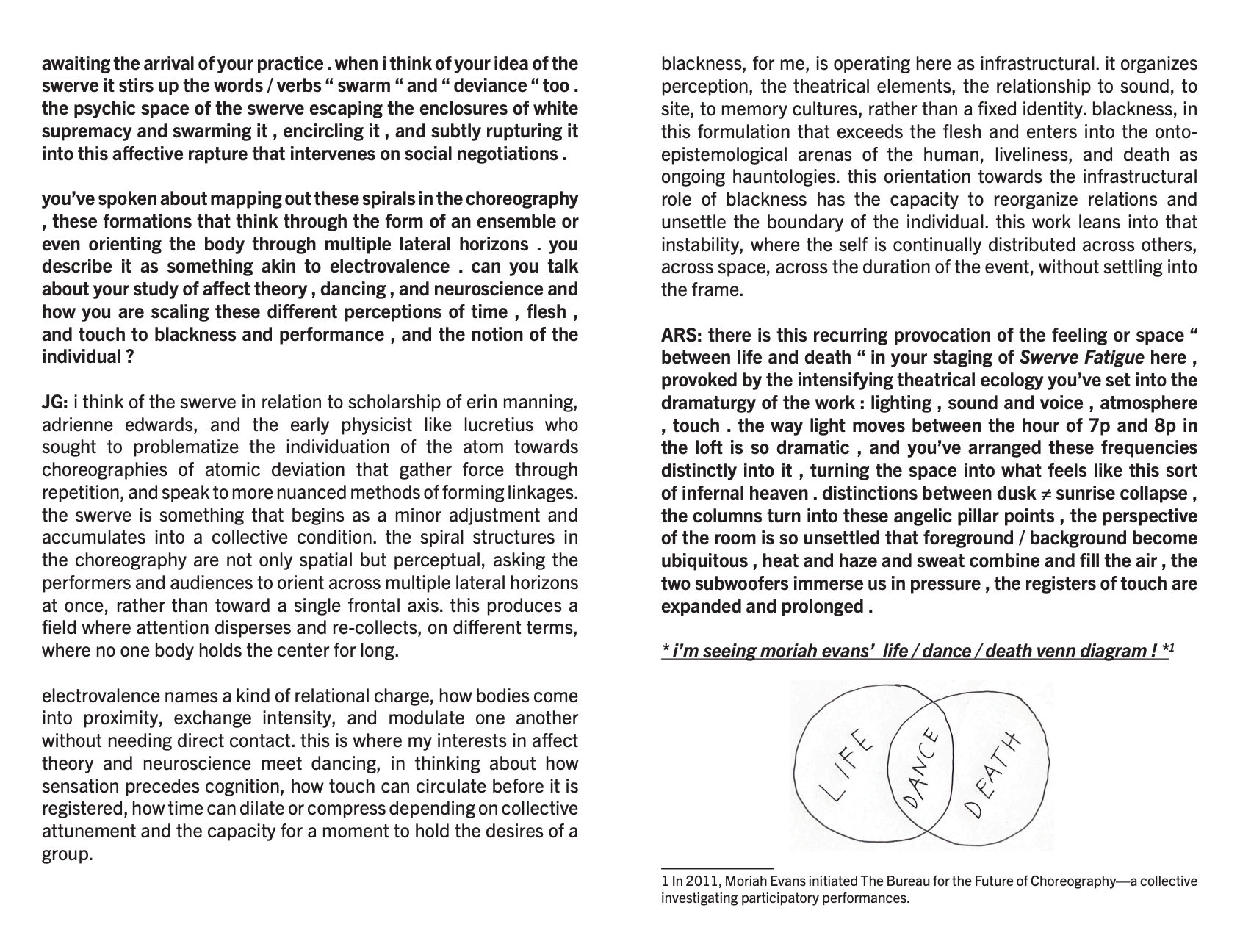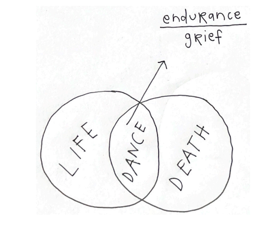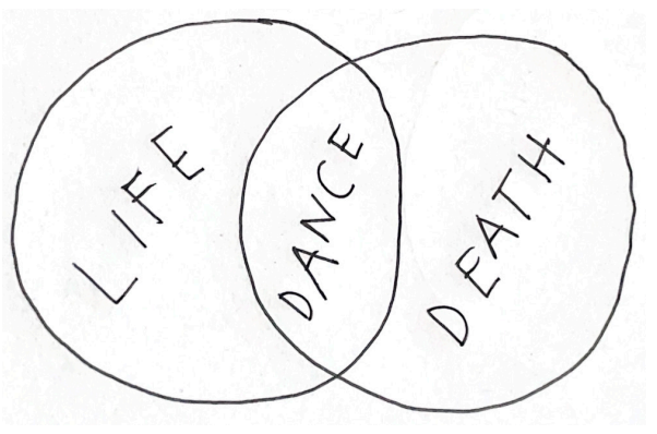 JG: i’m interested in that space between life and death, death and life, as a durational condition rather than a fixed threshold, something that lingers and stretches across the event. moriah evans’s diagram is a key touchstone here, where life and death remain distinct yet meet in that shared zone called dance. the work leans into that overlap, and traverses the divide, not to resolve it but to stay inside its tension, where movement holds both vitality and disappearance at once, where the memory cultures of these units—black life, land, inanimacy, the collective form—are cast on lateral planes to be in correspondence.
