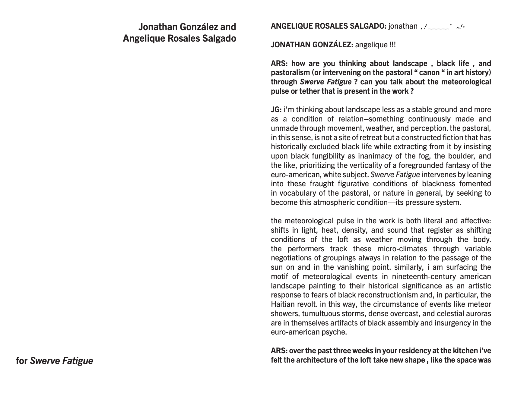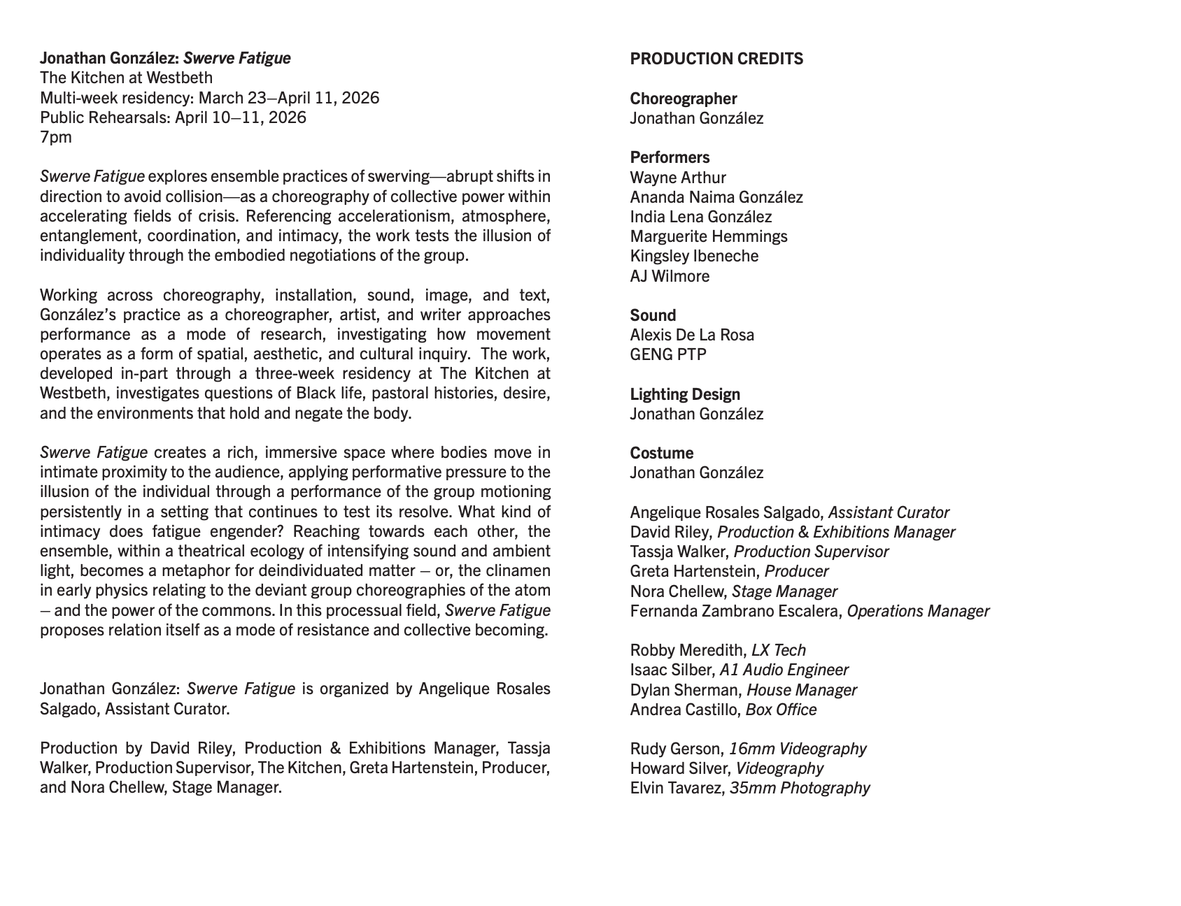 Jonathan González and Angelique Rosales Salgado, Assistant Curator, discuss Swerve Fatigue on the occasion of González's multi-week residency (March 23–April 9) and public presentation of the work at The Kitchen on April 10–11, 2026.