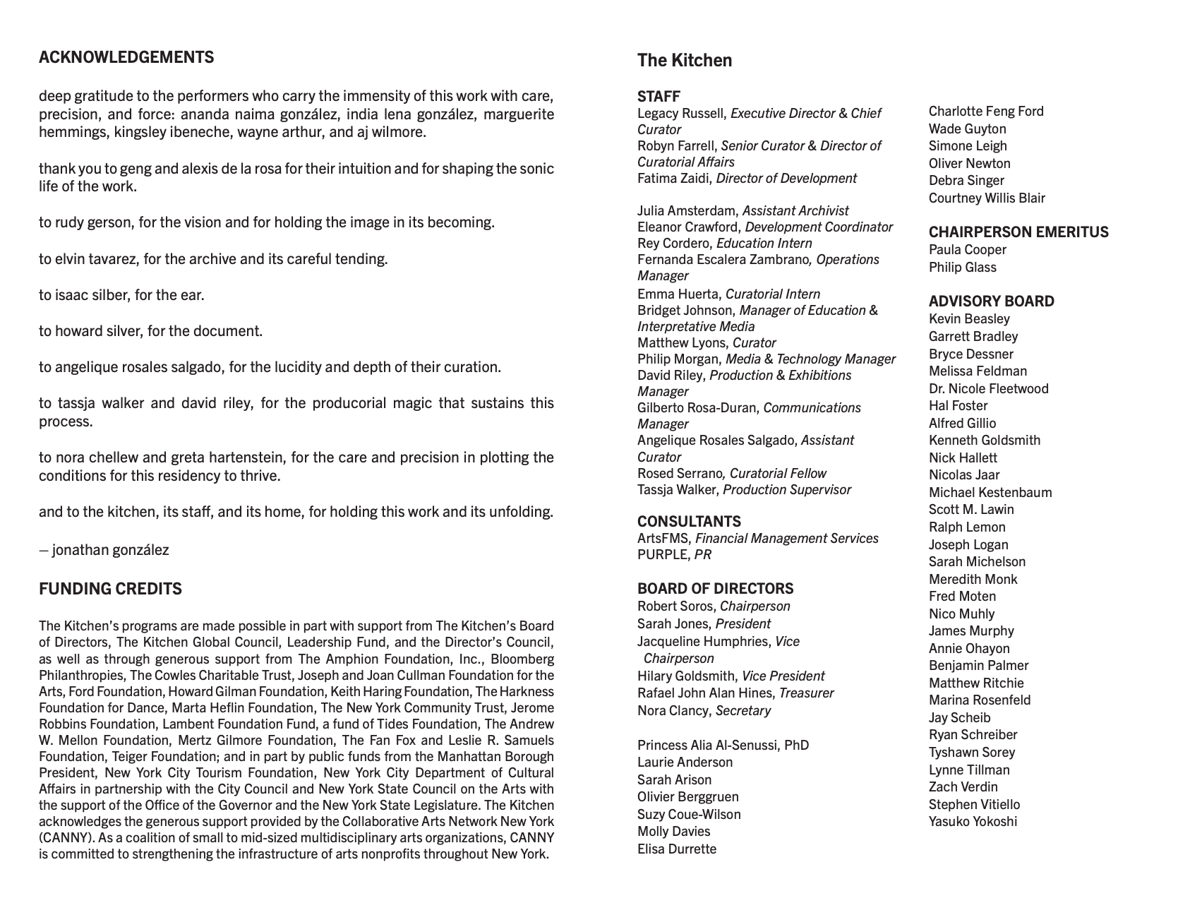 The Kitchen’s programs are made possible in part with support from The Kitchen’s Board of Directors, The Kitchen Global Council, Leadership Fund, and the Director’s Council, as well as through generous support from The Amphion Foundation, Inc., Bloomberg Philanthropies, The Cowles Charitable Trust, Joseph and Joan Cullman Foundation for the Arts, Ford Foundation, Howard Gilman Foundation, Keith Haring Foundation, The Harkness Foundation for Dance, Marta Heflin Foundation, The New York Community Trust, Jerome Robbins Foundation, Lambent Foundation Fund, a fund of Tides Foundation, The Andrew W. Mellon Foundation, Mertz Gilmore Foundation, The Fan Fox and Leslie R. Samuels Foundation, Teiger Foundation; and in part by public funds from the Manhattan Borough President, New York City Tourism Foundation, New York City Department of Cultural Affairs in partnership with the City Council and New York State Council on the Arts with the support of the Office of the Governor and the New York State Legislature.