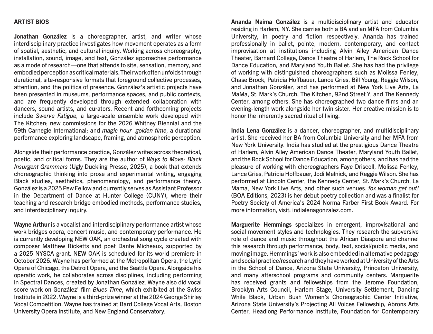 González is a 2025 Pew Fellow and currently serves as Assistant Professor in the Department of Dance at Hunter College (CUNY), where their teaching and research bridge embodied methods, performance studies, and interdisciplinary inquiry.
