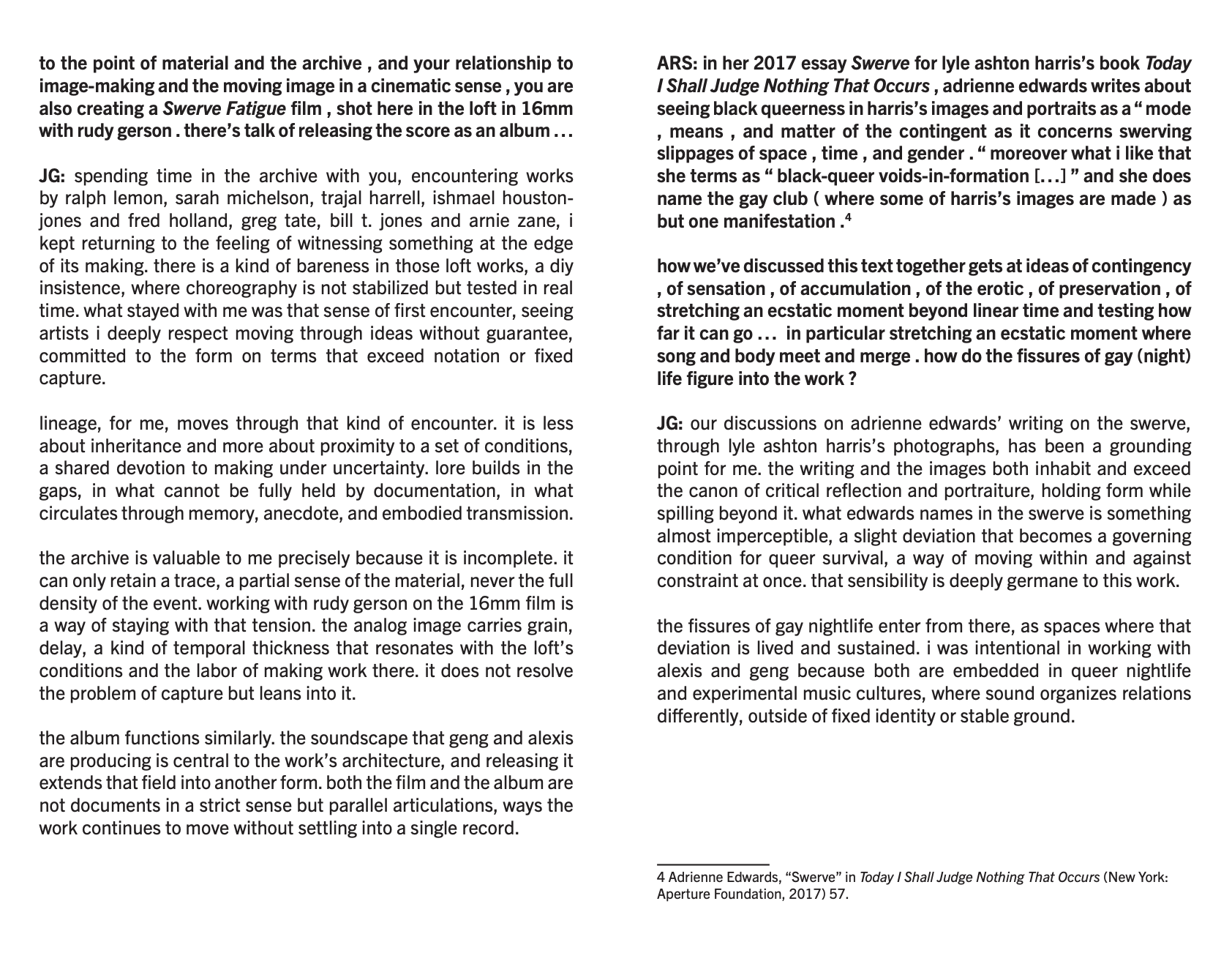 ARS: in her 2017 essay swerve for lyle ashton harris’s book Today i shall judge nothing that occurs , adrienne edwards writes about seeing black queerness in harris’s images and portraits as a “ mode , means , and matter of the contingent as it concerns swerving slippages of space , time , and gender . “ moreover what i like that she terms as “ black-queer voids-in-formation […] ” and she does name the gay club ( where some of harris’s images are made ) as but one manifestation . [4]