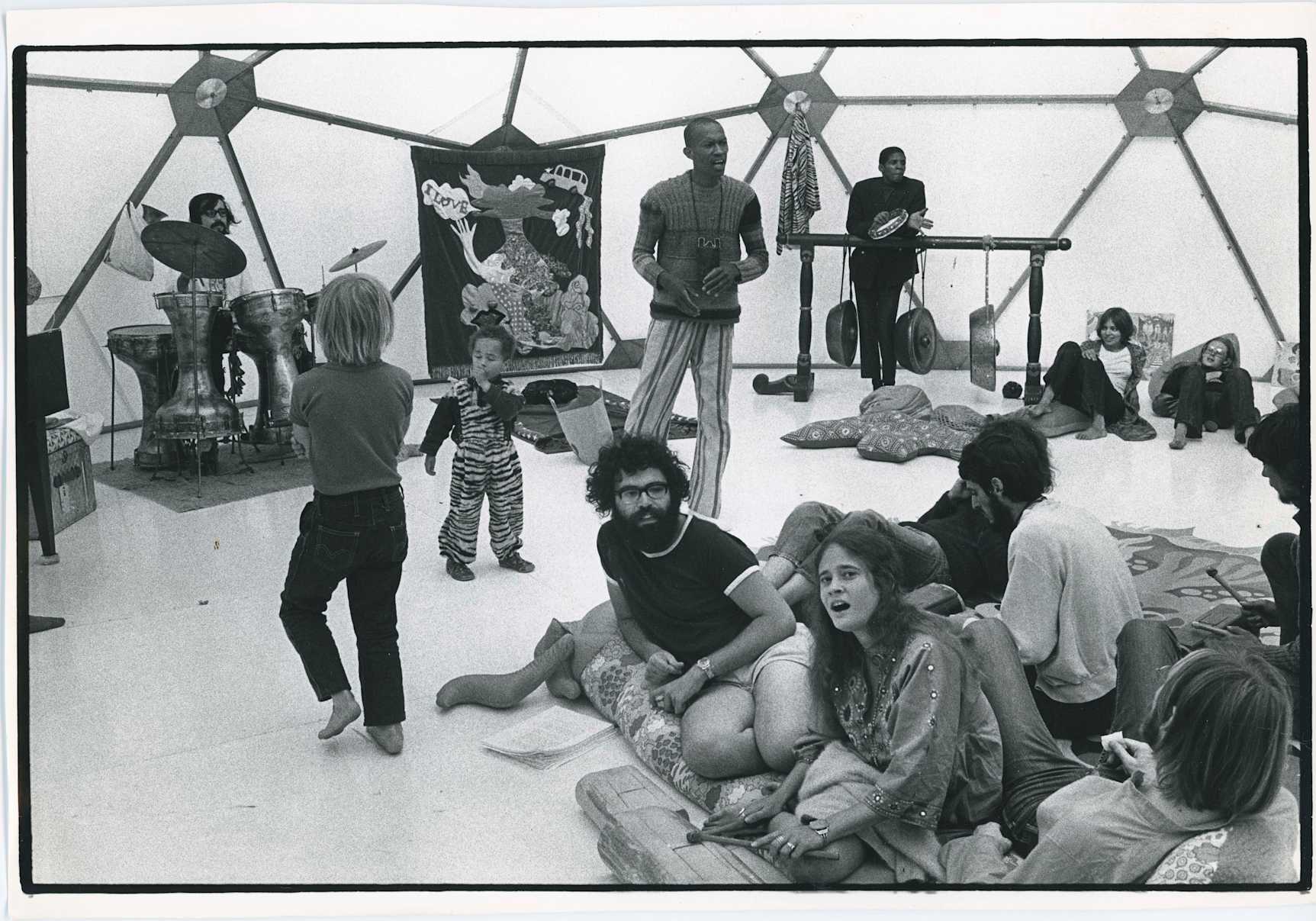 The pair began touring the Organic Music Society even before Tågarp. In one of the project’s earliest travels, for almost three months, they replicated the Congers geodesic dome for the 1971 exhibition Utopias and Visions 1871–1971 at the Moderna Museet in Stockholm. Other artists in the show, local and traveling audience members, and staff all passed through the space the Cherrys built, leaving their mark via their presence or through specific interventions responding to the context. Another example of early work: the first audiovisual and theatrical performance that Don and Moki led under the name Organic Music Theatre was at the 1972 Festival de jazz de Chateauvallon in the South of France, which is captured on the LP Organic Music Theatre (Blank Forms Editions, 2021). The group traveled to the venue in a van, gathering puppeteers, dancers, and acrobats along the way. On the outdoor amphitheater stage, a dozen Danish adults and children contributed with sound and movement to the performance. Later that year, they recorded Organic Music Society (Caprice Records, 1972), a masterpiece that explored the common language Don had crafted between disparate global genres, de-centering his own authorship and mastery in favor of performing compositions by other composers in a group setting.(10) “It is not my music,” Don once said of his work.(11) He and Moki sought a universal, free sound owned by none but accessible to all– music as a facet of the organic environment. As Don put it: “I wanted to play different instruments in… natural settings like a catacomb or on a mountaintop or by the side of a lake. I wasn’t playing for jazz audiences then, you realize. I was playing for goat herders who would take out their flutes and join me and for anyone else who wanted to listen or to sing and play along. It was the whole idea of organic music—music as a natural part of your day.”(12)