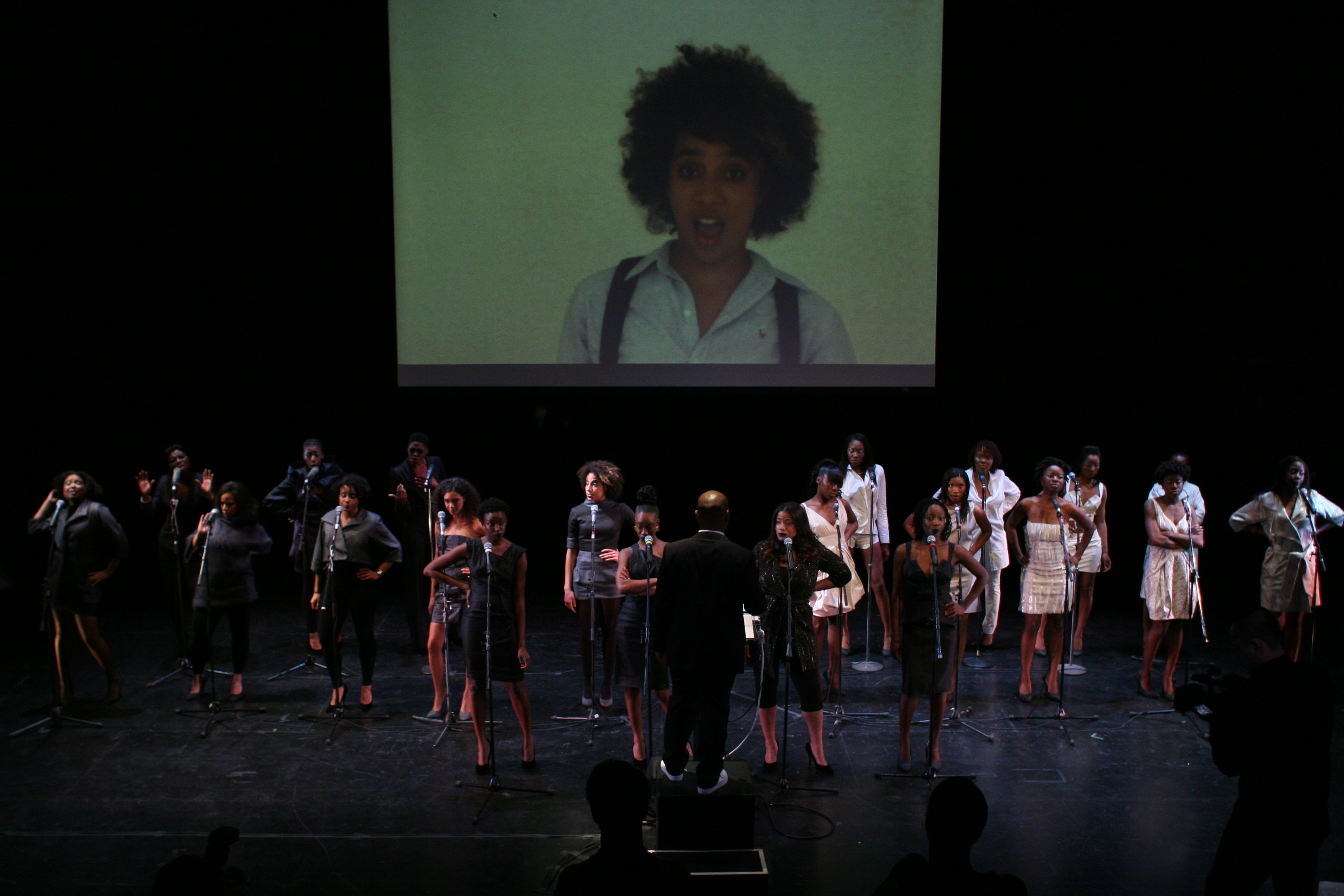 One of the final elements to join the chorus was the Conductor. Newsome stands on a platform just beyond the performers. His baton; a hacked Wii Remote. From this point forward each individual performance becomes a live remix. Newsome presses the A button and a clip of black femmes, in drag and/or varying in gender, plays on a screen above with the (presumably) cis-performers still vocalizing below. The performers in the clip offer a rolling “giiirl”. The B button offers a new black femme idiosyncrasy, and a third button, another. You start to hear new lilts to the same phrases, all no less familiar than before. The media flashes in and out of rhythm with the chorus, at Newsome’s will. When the performance comes to a close, the lights darken. The videos slow in reappearance, and only the live vocalists can be heard. One final, “Excuse!” is given before the stage goes silent.