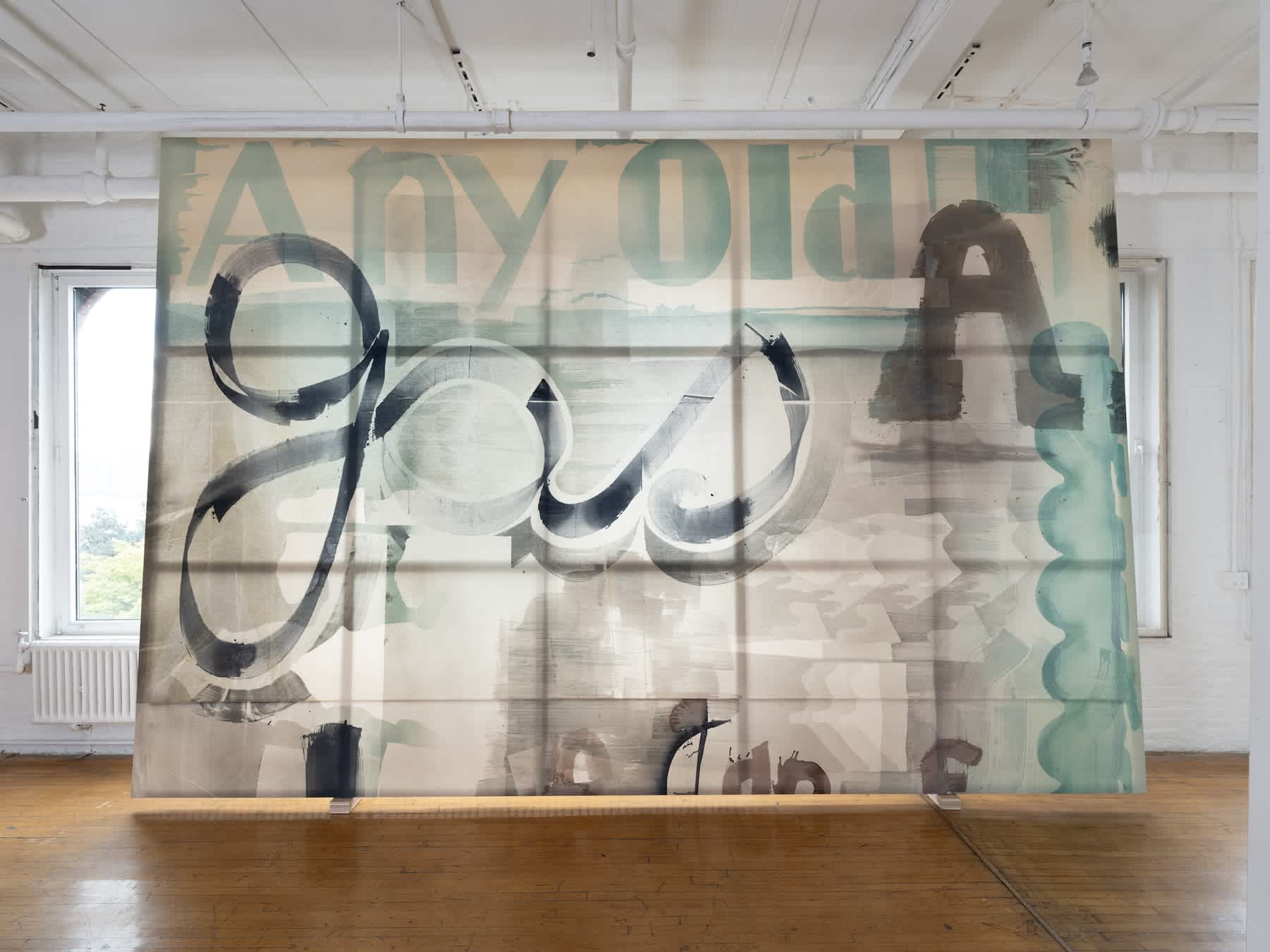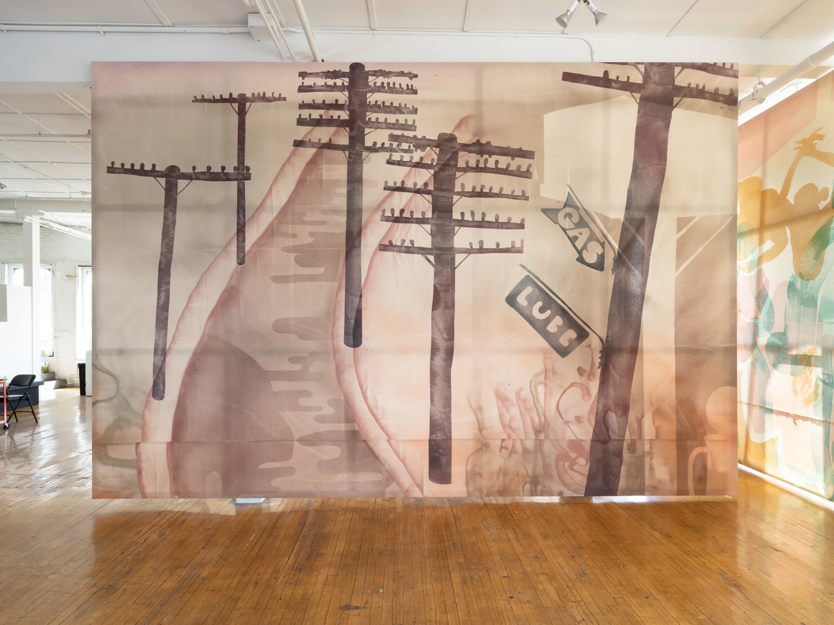 There's another site at play, which is the backdrop paintings. There are the large format works, which act as the backdrop—at their core the paintings for me have always been about collaboration due to their scale and their engagement with architecture. Due to that scale, they also engage with the body and with the bodies of people around them. A few years ago, I started to exhibit my paintings in public spaces outdoors, like at the Sharjah Biennial or at the Geneva Sculpture Biennial. The paintings were placed outdoors, they're exposed to rain, they're exposed to the sun. This engagement with sight and the public site started this possibility of an expression in public space for me.