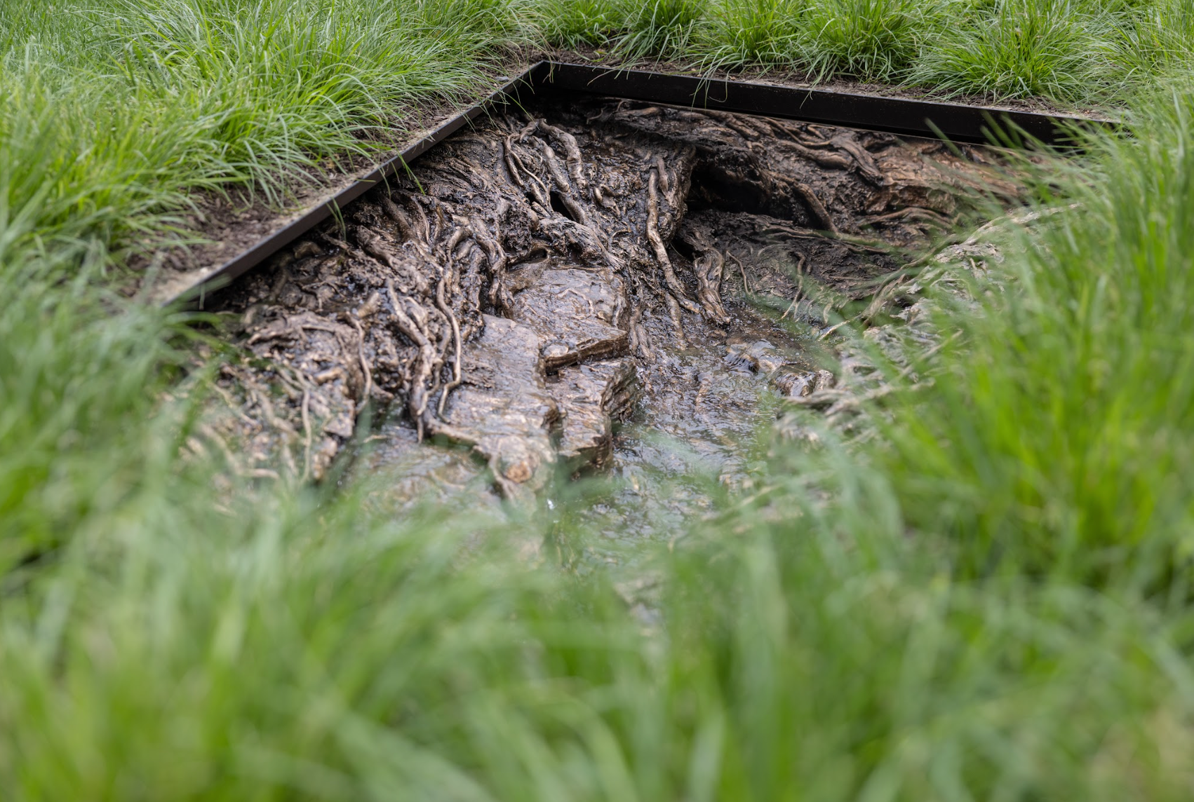 This situation of my practice met this incredible proposition to create a work in dialogue with Cristina Iglesias’s installation. There were a couple of things I noted about her work. I made a note during one of our first meetings with her about the idea that ecology is boundless. Because Iglesias’s piece was referencing historic ecology, I wanted to extend the hinge from past time to future time, with Shadow of the Sea reflecting forward. I additionally was really inspired by the modesty of Iglesias’s intervention in the park, which took the form of buried bronze sculptures tracing the path of the historic stream. There was a subtlety there, and a kind of anti-ego stance. The grandeur of the bronze material was so intense, but then she made a point to hide it away in the grasses that she planted along the edges of the sculptures.