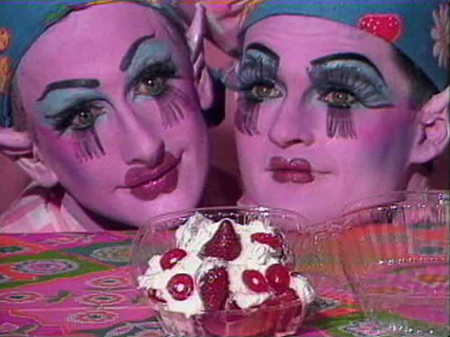 Drawing on TV ads, many of Rubnitz’s works in the retrospective were short-form, including the sickly sweet Strawberry Short-Cut, a minute-long commercial for Lady Bunny’s easy-to-prepare dessert hack. Rubnitz riffs on the commercial format, using the video to advertise a donut dressed in jelly, cherry 7UP, whipped cream, and fresh strawberries. The dessert’s superfluity, a stand-in for a ripening neon consumerism, compounds with Rubnitz's visual language to underscore an aesthetic rejection of the emergent professional-class masculinity hatched by the rapid accumulation of wealth on Wall Street and its corollary cultural fixings.