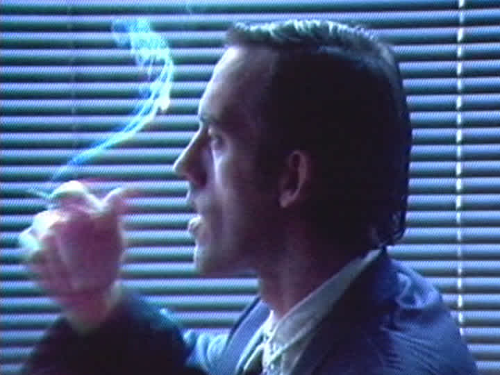 In 1992, the same year the retrospective screened at The Kitchen, Rubnitz collaborated with artist, writer, activist, and Kitchen alum, David Wojnarowicz to create a new work. The video, titled Listen To This, is a departure from Rubnitz's signature vibrant, alien world. Wojnarowicz, wearing a navy blue suit and with his hair slicked to the side, sits in front of drawn blinds. In the first half of the video, he speaks in first-person as television. Here, the medium is the messenger: “My job is to give you a false sense of comfort, or safety, or fear, or confusion,...to make your life a schizophrenic hell.” (3)
