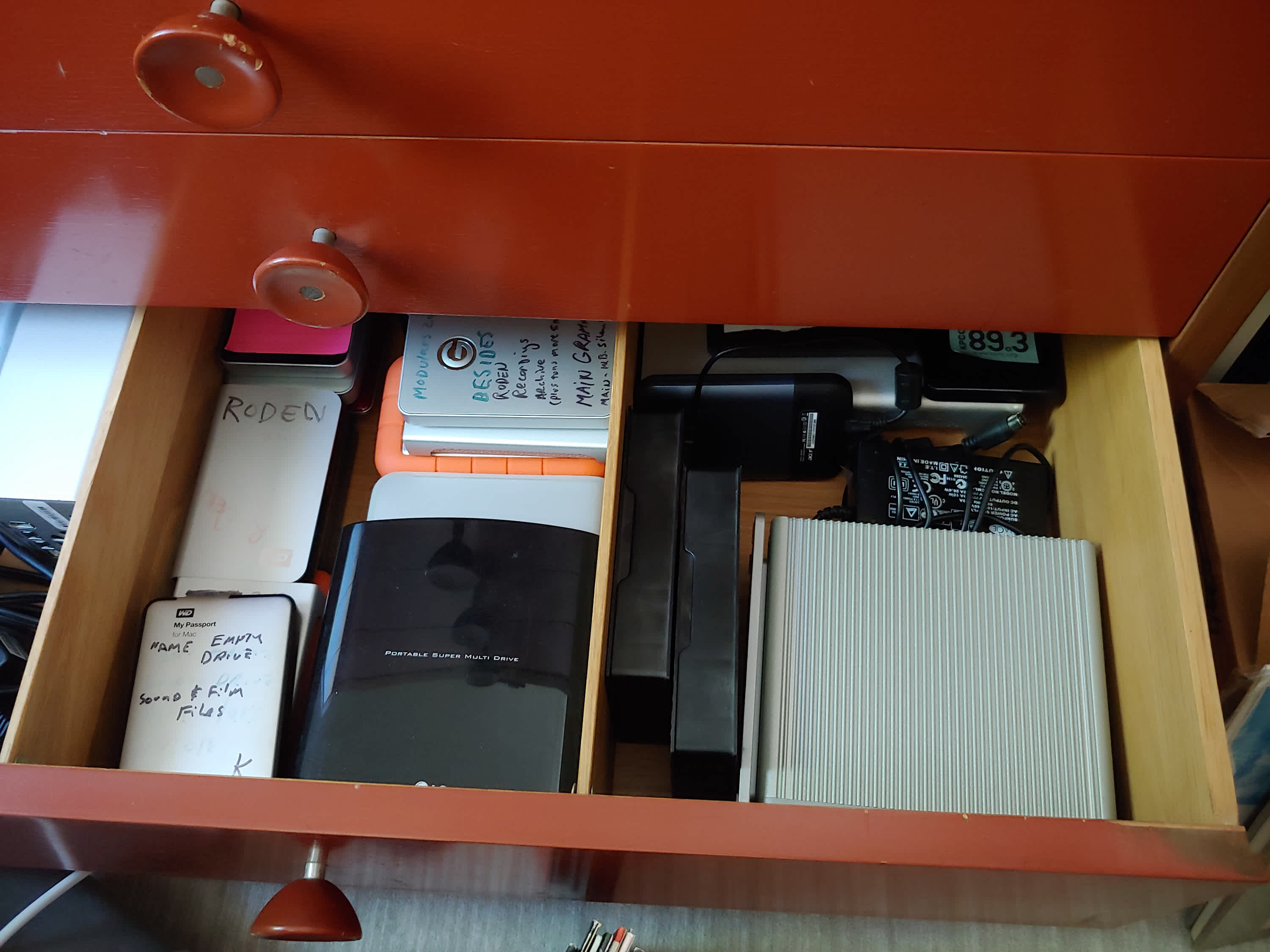 Michael focused on organizing digital media onto an 18TB master drive. I began sorting through the physical formats. On each visit to Pasadena, I’d take a box or two home with me, sometimes also having originals shipped. The process was both overwhelming and deeply intimate. The audio and video formats have included DAT tapes, standard and 4-track cassettes, MiniDiscs, CDRs, as well as hi8, VHS and DV videos.