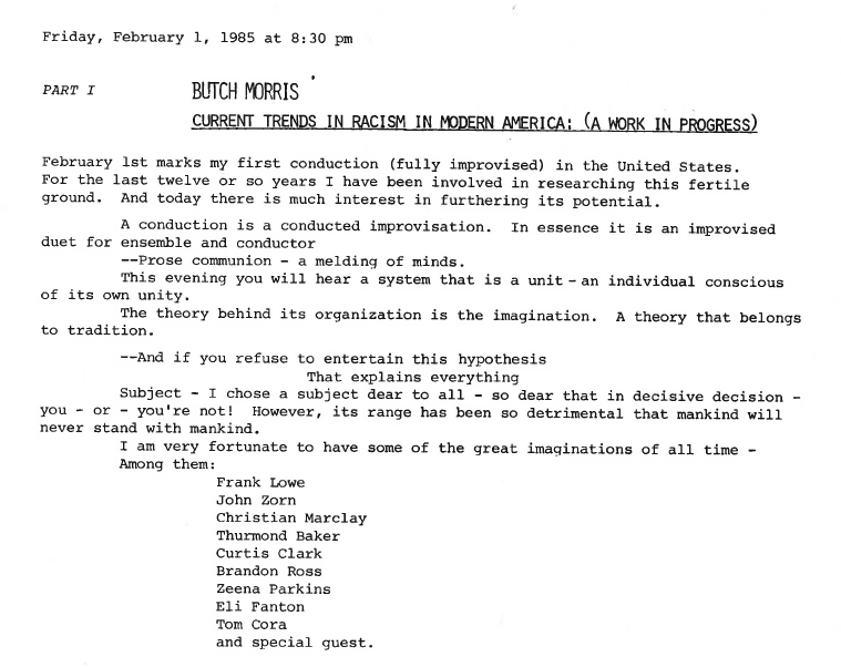 After twelve years of research, Morris debuted the first chronological Conduction® at The Kitchen on February 1, 1985, in the performance titled Current Trends in Racism in Modern America: (A Work in Progress). The performance featured Brandon Ross on guitar, Zeena Parkins on harp, Thurman Barker on the marimba, Curtis Clark on piano, Frank Lowe on tenor saxophone, Christian Marclay on turntables, Eli Fountain on the vibraphone, Yasunao Tone on voice, Tom Cora on cello, and John Zorn on alto saxophone and game calls.