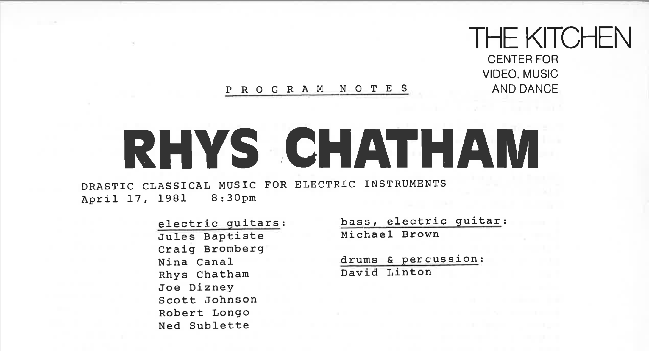 This Video Viewing Room features an archival recording of this performance alongside an introductory text written by Rhys Chatham and related images and ephemera from The Kitchen’s archive.