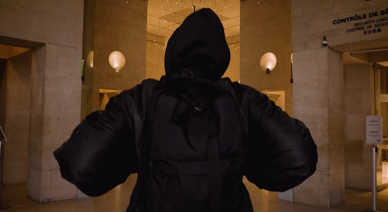 GROTESQUE: They make beautiful things about ugly people (2023) follows the wanderings of a life-size, anthropomorphic object in the Louvre Museum’s collection of Egyptian antiquities. Marginalized by her misshapen appearance, the object—a distorted, mask-like terracotta figurine from the Roman period—attracts the gaze of other visitors. A group of the friends parading around the museum encounter the sculpture, until they find themselves moved, in front of the glass panes of a collection hall where they realize their ancestors are none other than the grotesque figurines. The artist empowers this unsung sculptural object to contemplate its own deliberate erasure at the margins of a dominant canon, questioning and satirizing the grotesque as a representation of that which is “ugly” in the classical European collection foundational to the Louvre Museum. Reflecting on her personal experience, Oyiri describes feeling “half-triggered” and “half-blown away” when encountering the extensive halls of the Louvre’s collection. Sometimes humorously across different historical and autobiographical positions, her filmic works juxtapose the outcomes of this affect, and codify how warfare (of all scales), too, is itself a visual practice.