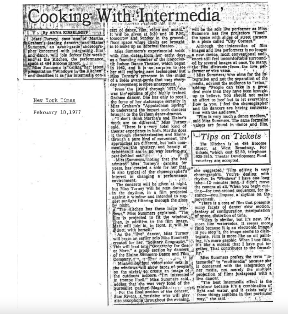 From July 29–August 26, 2021, this Video Viewing Room presented the digitized 16mm film Windows in The Kitchen (1981). Based on conversations with artist Paula Court, who assisted Summers in filming, we believe this film was shot in late 1976 in preparation for the performance of the same title, which took place over one weekend in February 1977 at The Kitchen and included film, video, slide projection, live music, and dance. (Later, Summers likely decided to make the 16mm element of the intermedia work its own film-dance, which explains this work’s 1981 date.) The dancer featured in the film is Matt Turney (1925–2009), one of the first Black dancers in the Martha Graham Company, where she was a featured performer from 1950s until the early ’70s. The film’s vocal soundtrack— provided by the acclaimed musician, composer, and educator Jay Clayton—was added for this 1981 version. Court, who is now The Kitchen’s house photographer, provided the camera work. Just before the weekend performances, The New York Times published a preview piece, reproduced below, that describes what was planned.