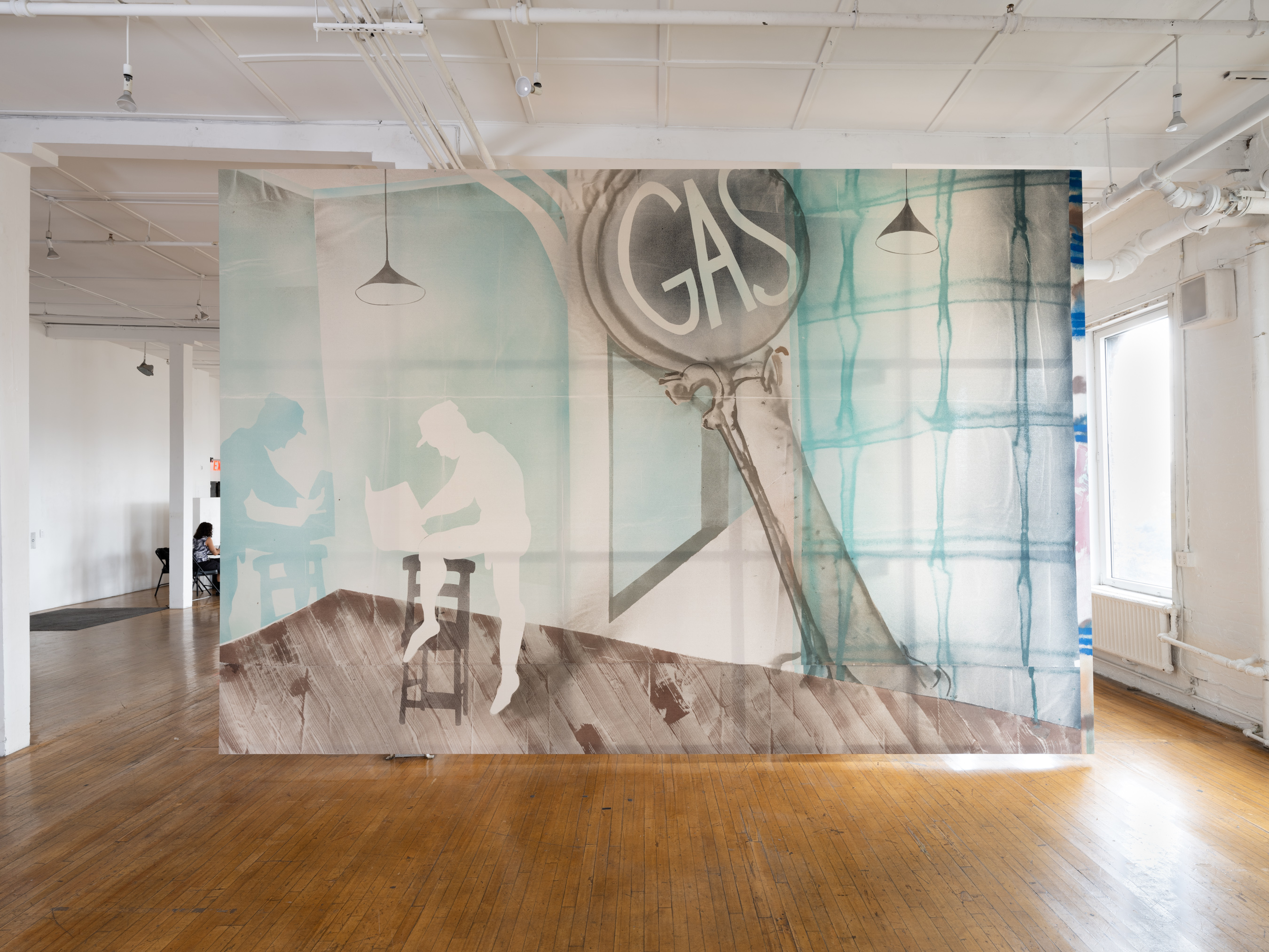 Lutz-Kinoy’s restaging considers this 1938 work of American dance through a contemporary lens, creating a dynamic, queered space for reflection on race, class, and gender. The multi-site presentation in New York brings together a culmination of research begun in 2020 with collaborators in Paris, Vienna, and Berlin. Archival elements drawn from Lutz-Kinoy’s research are on display as a document of three years of discovery, including reproductions of Paul Cadmus’s drawings and photographs by photographers George Platt Lynes and Fred Melton, alongside new photography by artist Mary Manning. Central to the exhibition is a series of immersive paintings by Lutz-Kinoy, inspired by Walker Evans’s photographs and Cadmus’s historic sets for the original Filling Station ballet. The artist’s canvases here utilized as set design for the rehearsal process merge into new architectures and relationships between the technical mechanics of the originating performance and its contemporary representation.