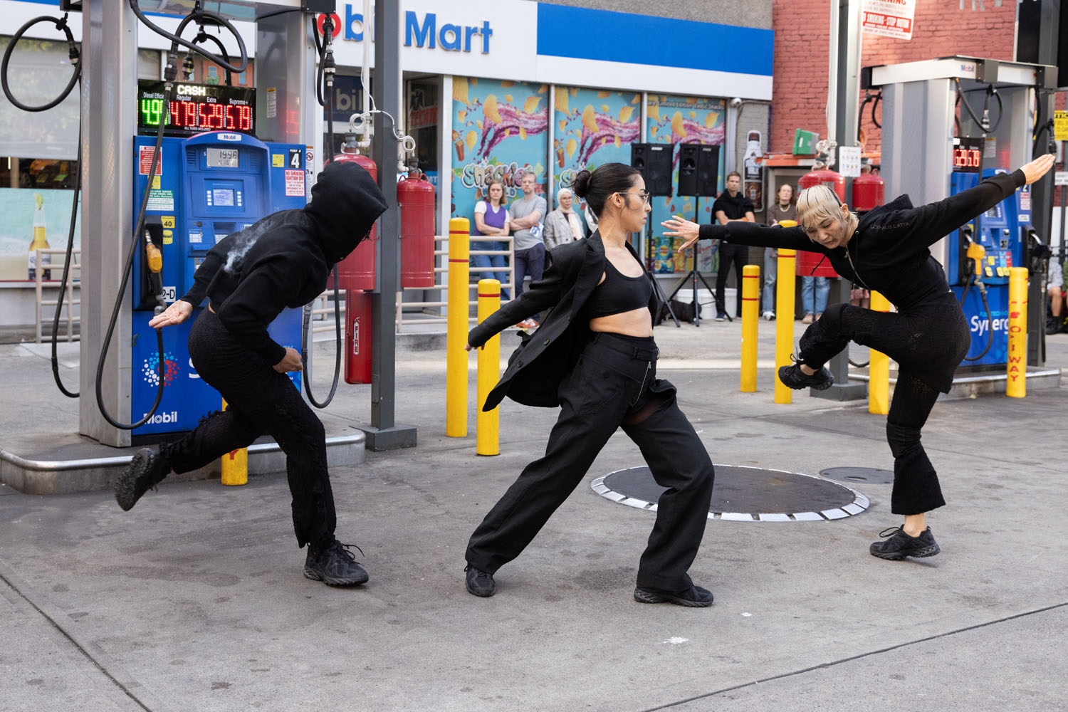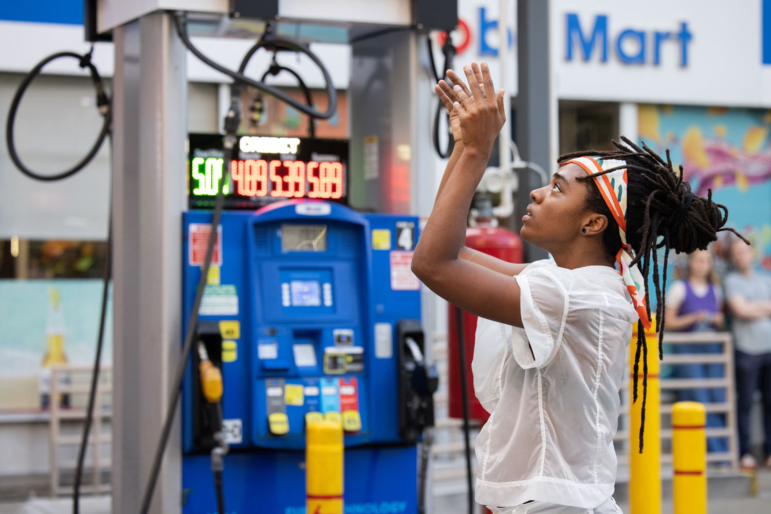Lutz-Kinoy’s Filling Station features new choreography Niall Jones (lead choreographer) and Raymond Pinto (consulting choreographer); a new music score made by James Ferraro; a set design by Lutz-Kinoy; and costumes by Mike Eckhaus and Zoe Latta of fashion label Eckhaus Latta. The ensemble of dancers includes Bria Bacon, Ayano Elson, Maxfield Haynes, Niall Jones, Kris Lee, Niala, and Mina Nishimura.