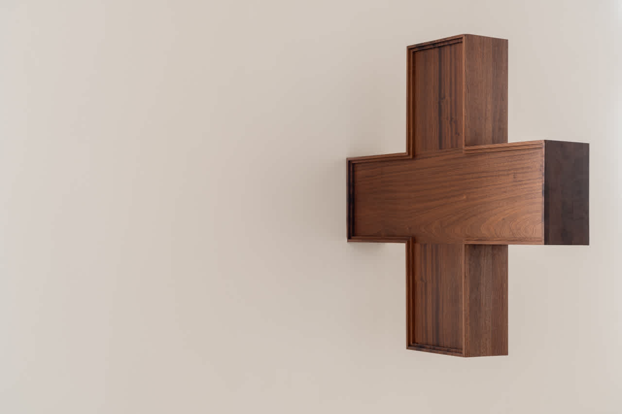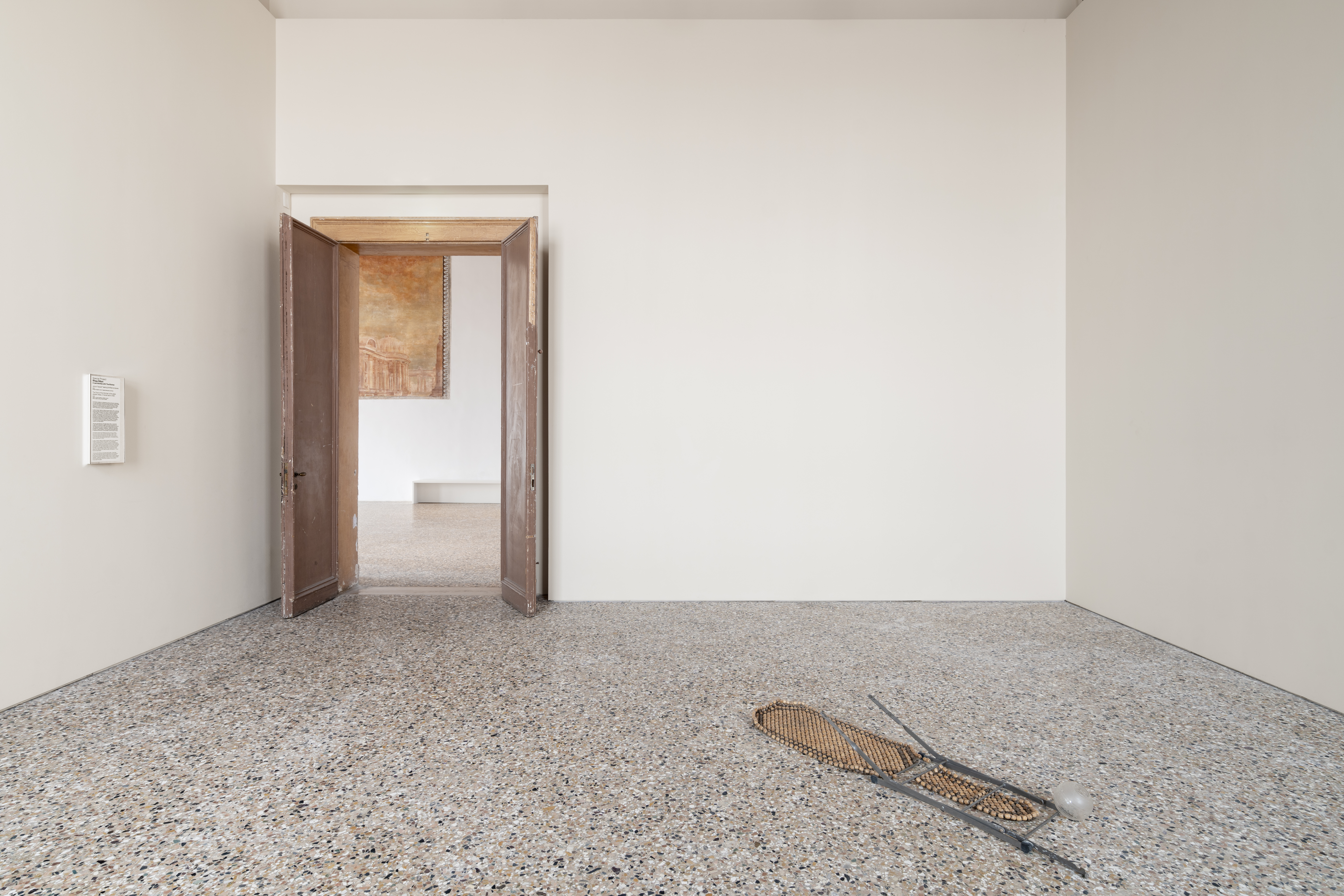 In Janus pause leaking fortified enclaves, a sapele mahogany cross will slowly drip water onto the floor of Palazzo Diedo throughout the duration of the exhibition. The second work installed in the space is The Door of the Woman is the glass slipper (Atlas, in transit laid to rest), a 2022 sculpture that engages with the history of assemblage.