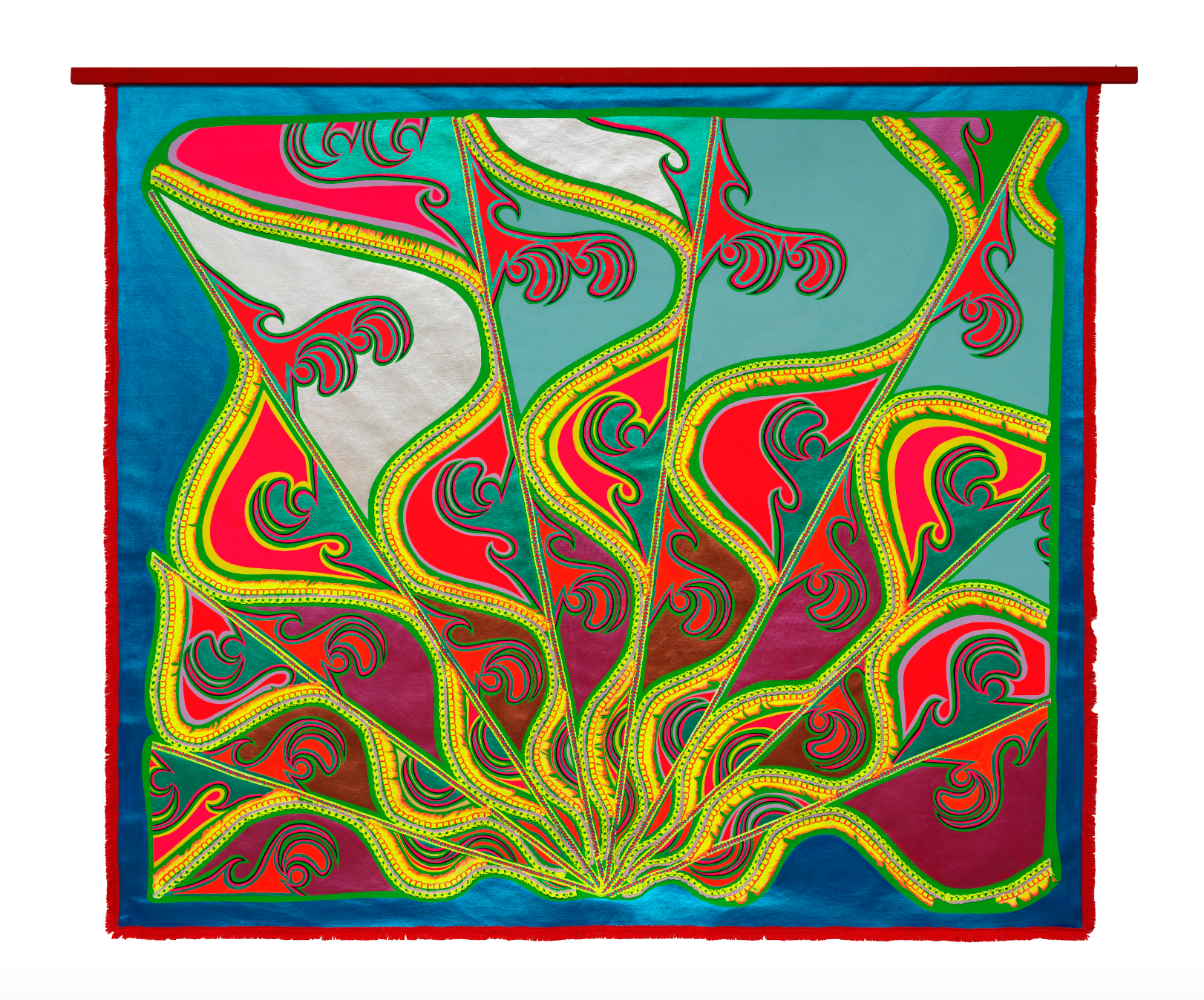 Lisa Alvarado (b. 1982, San Antonio, TX) is an artist and musician based in Chicago. Her practice gravitates towards creative traditions of overcoming and exuberant forms of resilience. She plays harmonium in the band Natural Information Society and uses her free-hanging paintings as mobile stage sets for their performances. Alvarado’s perspective is rooted in the under-represented American history of the Chicanx/ Mexican American diaspora. Her recent solo exhibitions include Spiral Yellow at The Modern Institute, Glasgow (2024); Spinning Echo at Bridget Donahue, New York (2023); Lisa Alvarado / MATRIX 192 at the Wadsworth Atheneum Museum of Art, Hartford (2023); Pulse Meridian Foliation at RedCat, Los Angeles (2023). She has been included in the recent group exhibitions Resonant Earth at the Moody Center for the Arts, Houston (2024); Calling at Kunstverein Rheinlande und Westfalen, Düsseldorf (2023); Contemporary Cartographies at the Museum of Contemporary Art, Jacksonville (2023); File Under Freedom at Bergen Kunsthall, Norway (2022); Whitney Biennial : Quiet As It’s Kept at the Whitney Museum of American Art, New York (2022). Alvarado played harmonium on ten albums released on Eremite, Aguirre, and Drag City records. She has recently performed at Inhotim Museum, Brazil (2024); Knockdown Center, New York (2024); Le Guess Who Festival, Utrecht (2023); Jazzfest Berlin, Germany (2023); Pioneer Works, New York (2023); Jazz em Agosto, Gulbenkian Foundation, Lisbon (2023); Jazztopad, Poland (2022); Vision Festival, New York (2022); Pitchfork Music Festival, Chicago (2022).