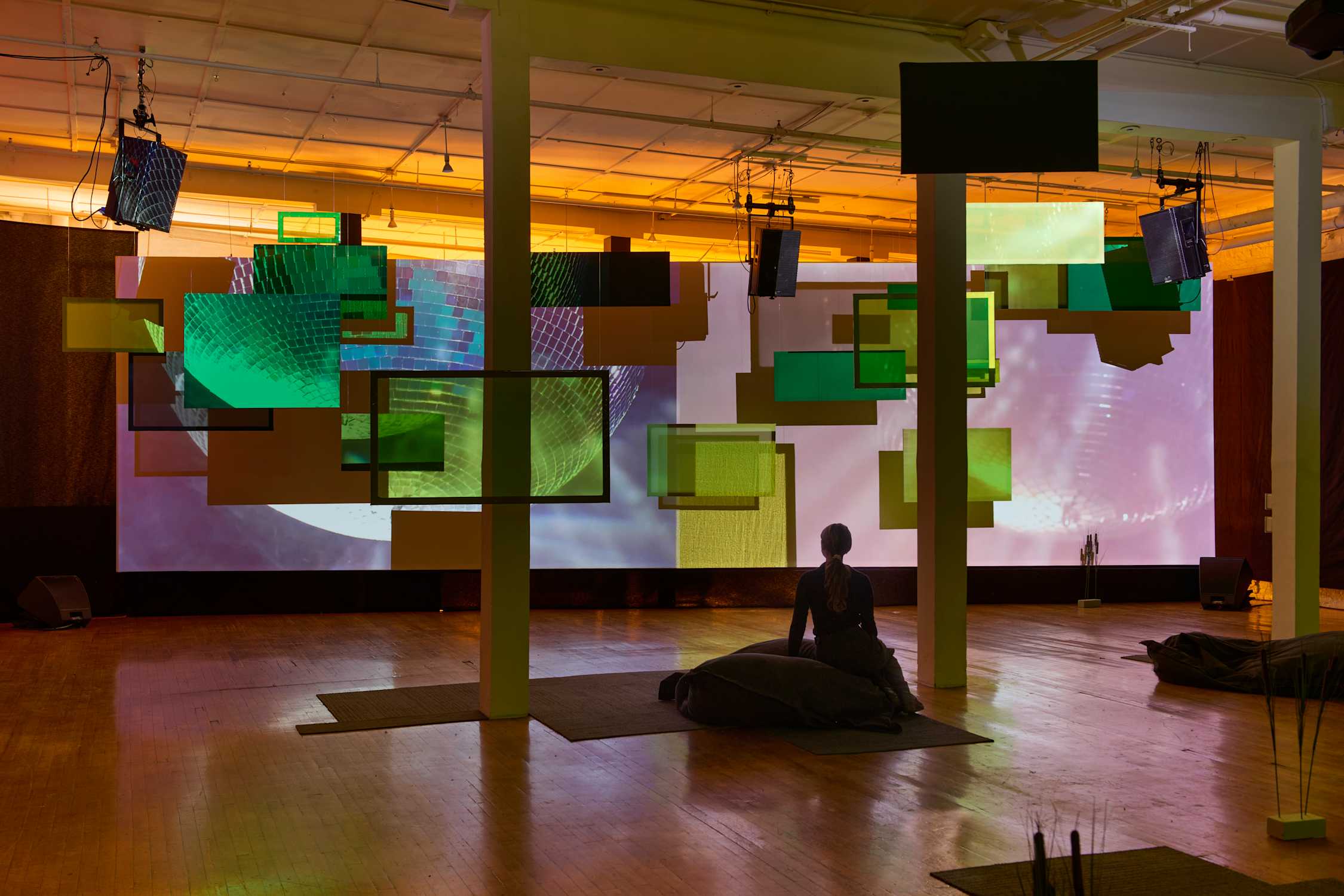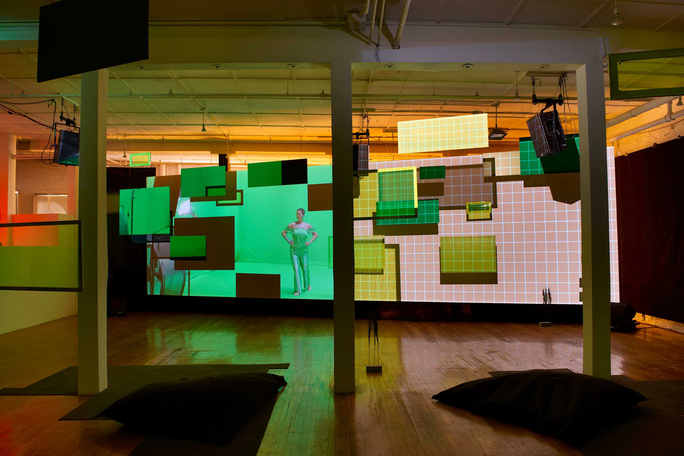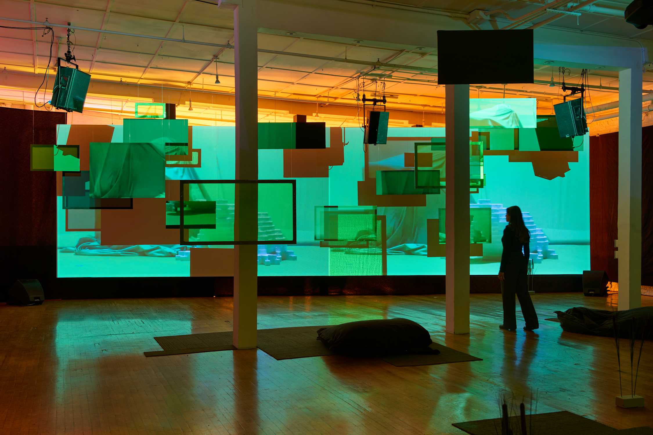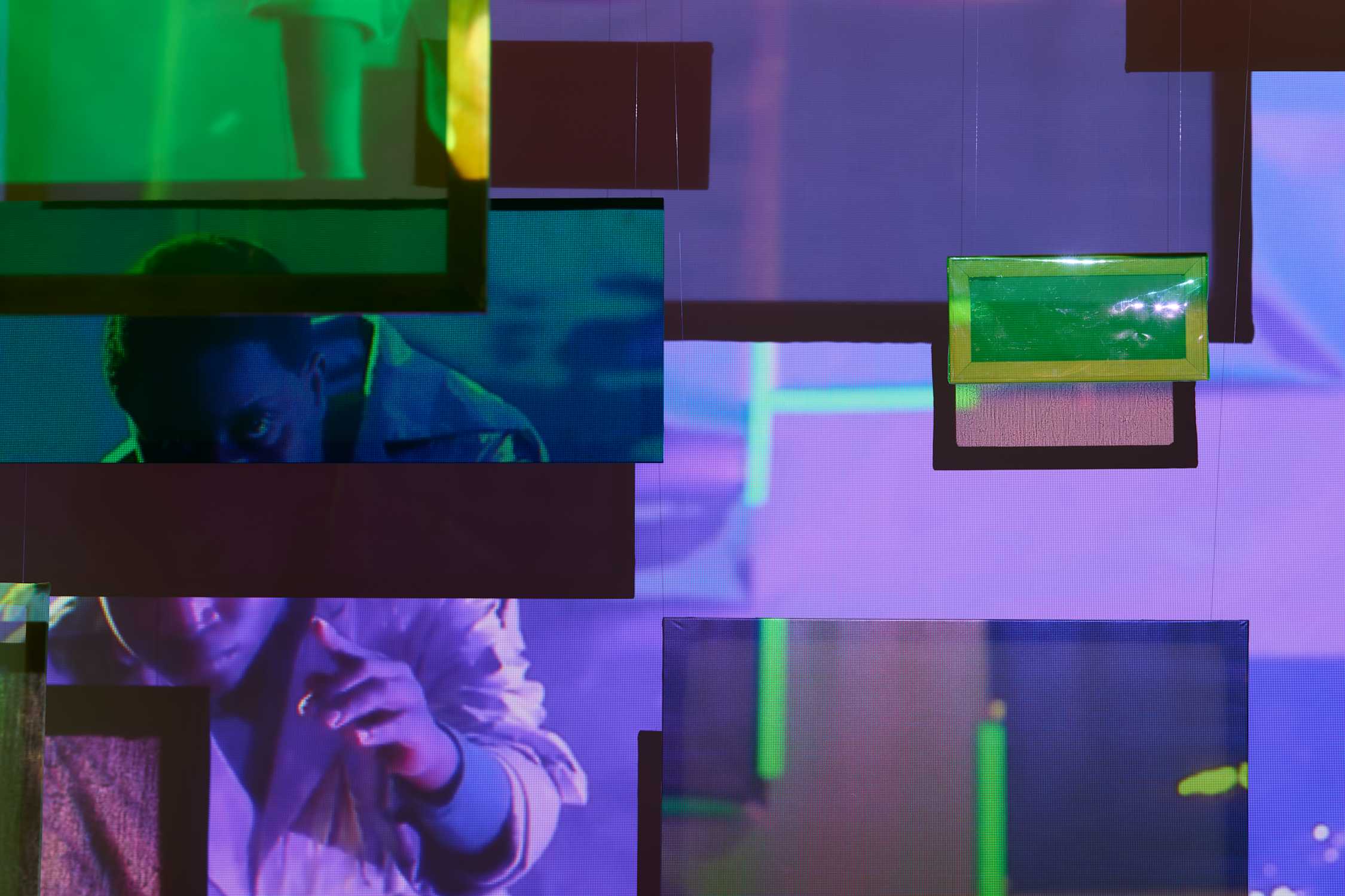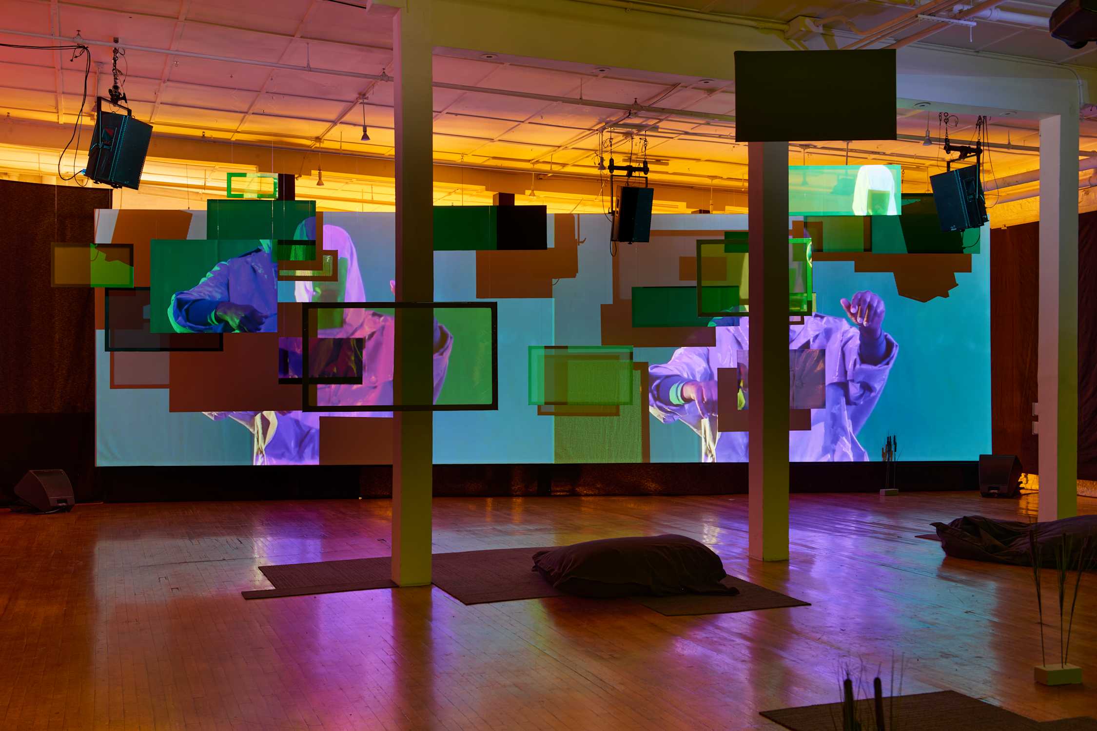Using the techniques and technologies associated with photography, cinema, and the stage, Rawls’ [siccer] challenges divisions between the living, the captured, the rehearsed, and the performed. Experimenting with stop-motion animation, the work features a compilation of still images that have been stitched together to produce moving images depicting a cast of Black dancers in various states of movement. These stop-motion videos are then projected onto chroma green frames suspended from the ceiling, reminiscent of the green screens commonly associated with film production. At once caught, distilled, fragmented, and unfinished, gestures glitch in and out of focus across Rawls’ cinematic scaffolding, which both literally and metaphorically speaks to the complex visibility of Blackness in contemporary society.
