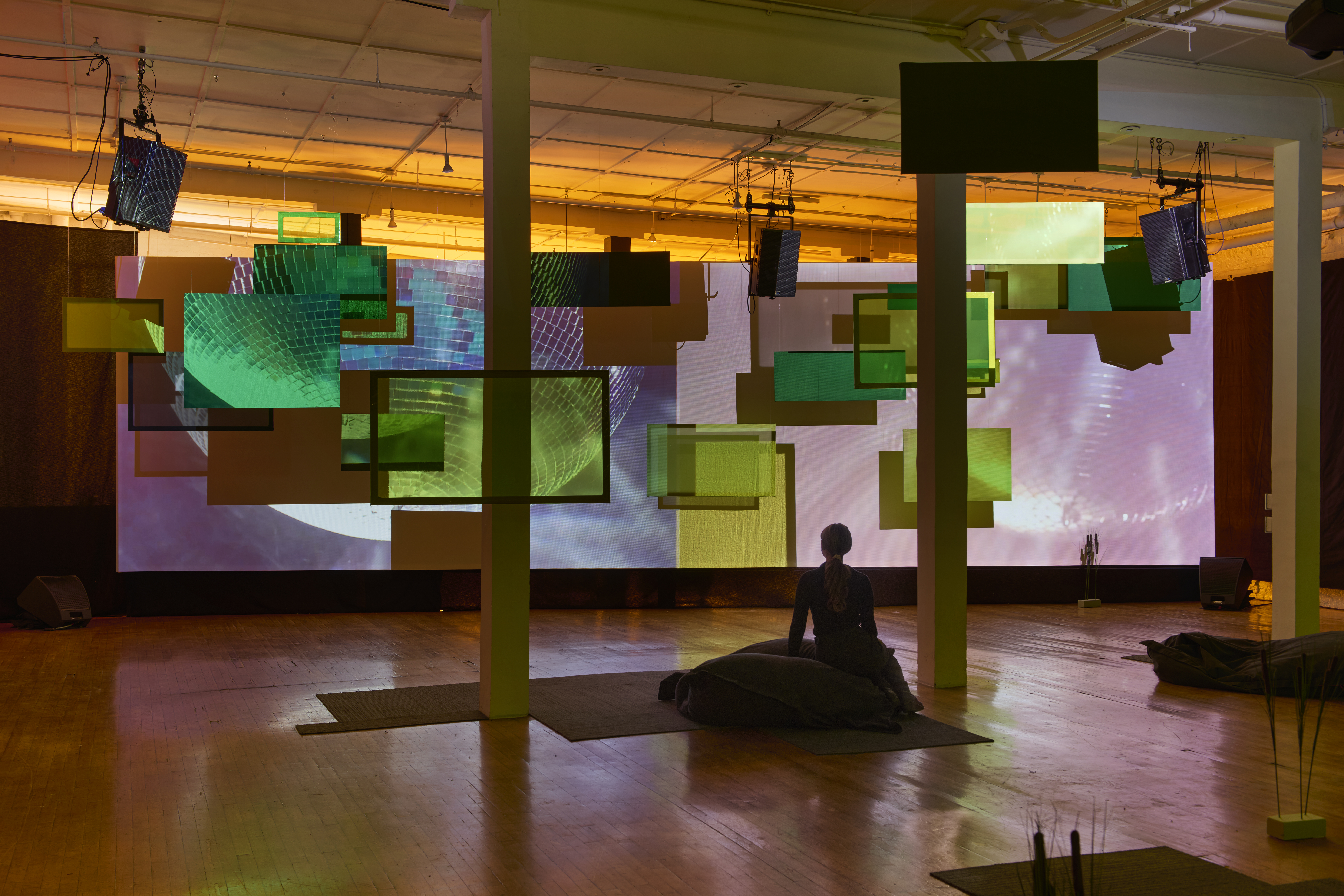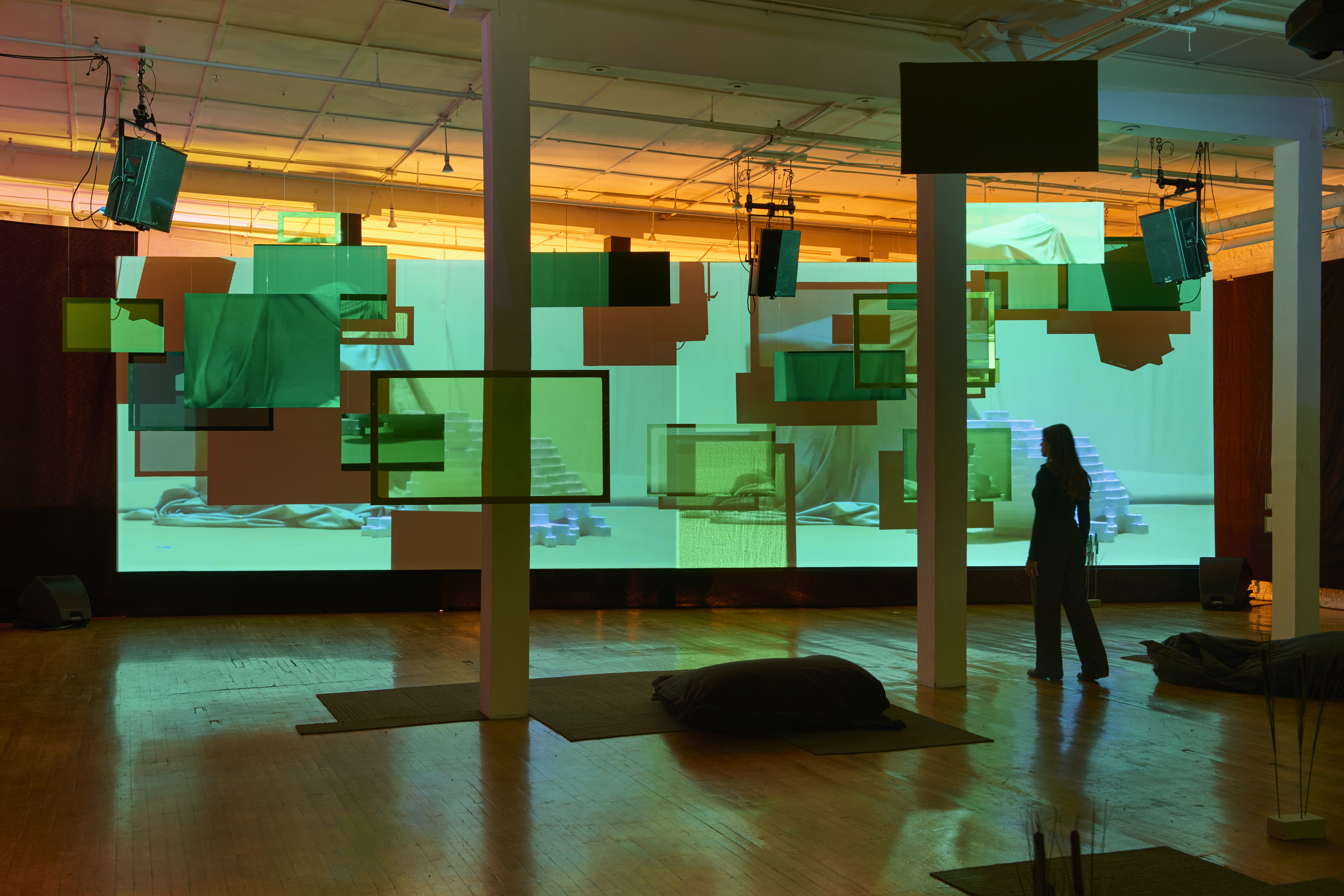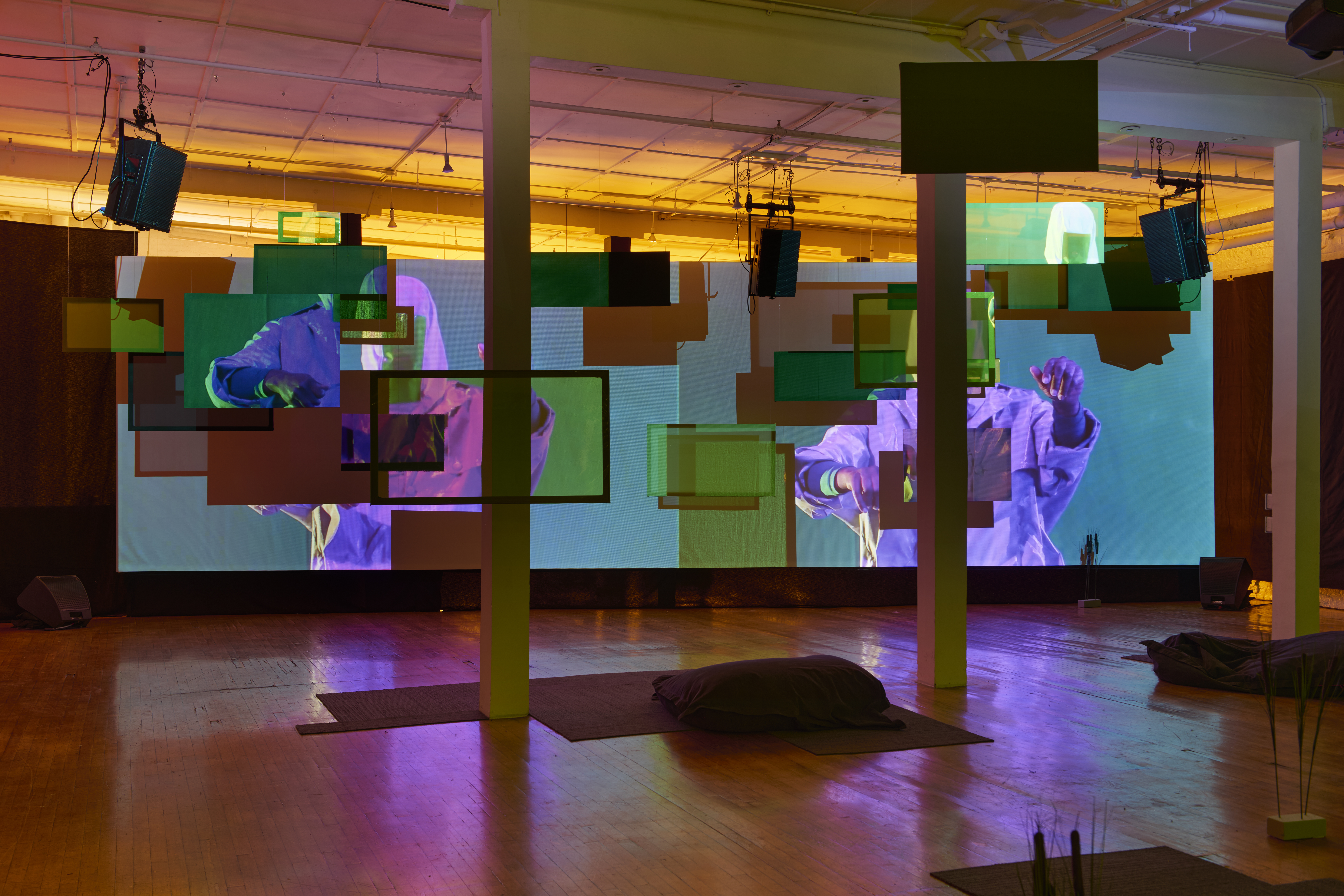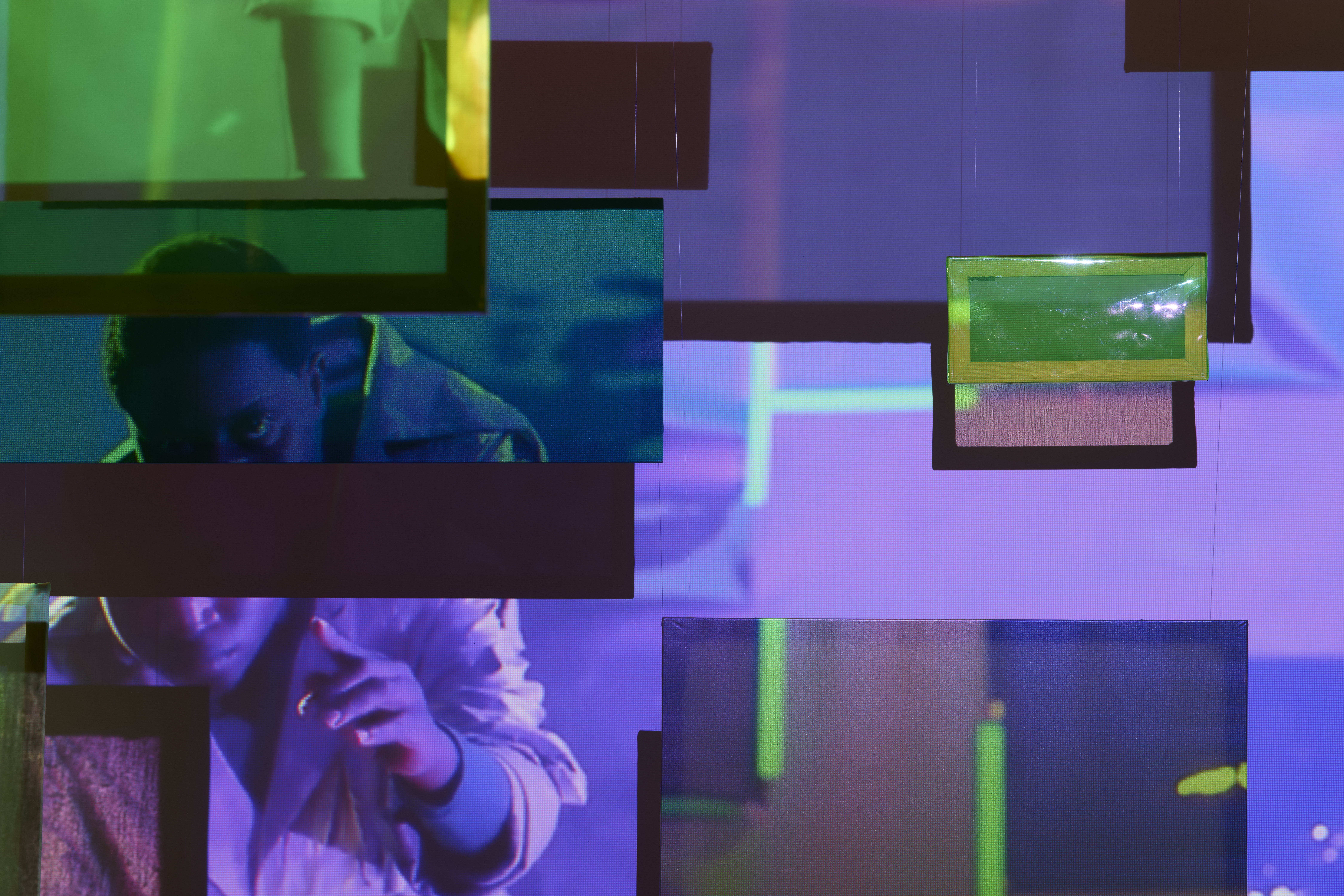 Using the techniques and technologies associated with photography, cinema, and the stage, Rawls’ [siccer] challenges divisions between the living, the captured, the rehearsed, and the performed. Experimenting with stop-motion animation, the work features a compilation of still images that have been stitched together to produce moving images depicting a cast of Black dancers in various states of movement. These stop-motion videos are then projected onto chroma green frames suspended from the ceiling, reminiscent of the green screens commonly associated with film production. At once caught, distilled, fragmented, and unfinished, gestures glitch in and out of focus across Rawls’ cinematic scaffolding, which both literally and metaphorically speaks to the complex visibility of Blackness in contemporary society.