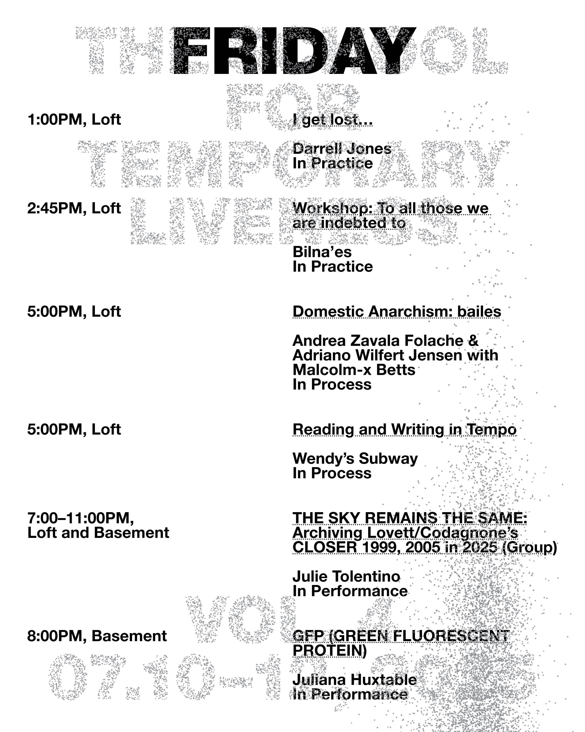 The School for Temporary Liveness Vol. 4 is organized by guest curators Lauren Bakst and Niall Jones, with Matthew Lyons and Angelique Rosales Salgado, The Kitchen. Production by David Riley, Production & Exhibitions Manager, and Tassja Walker, Production Supervisor, The Kitchen.