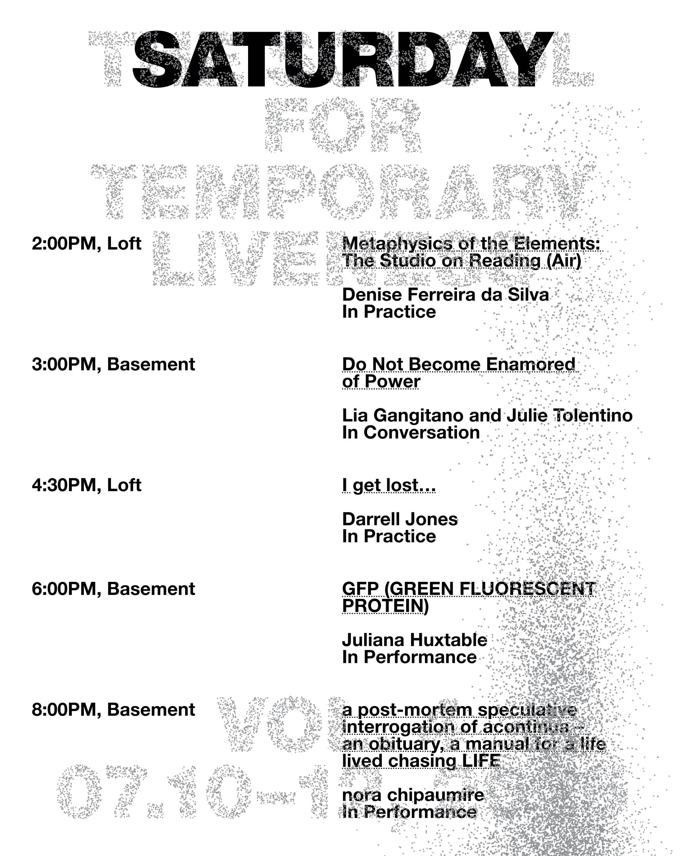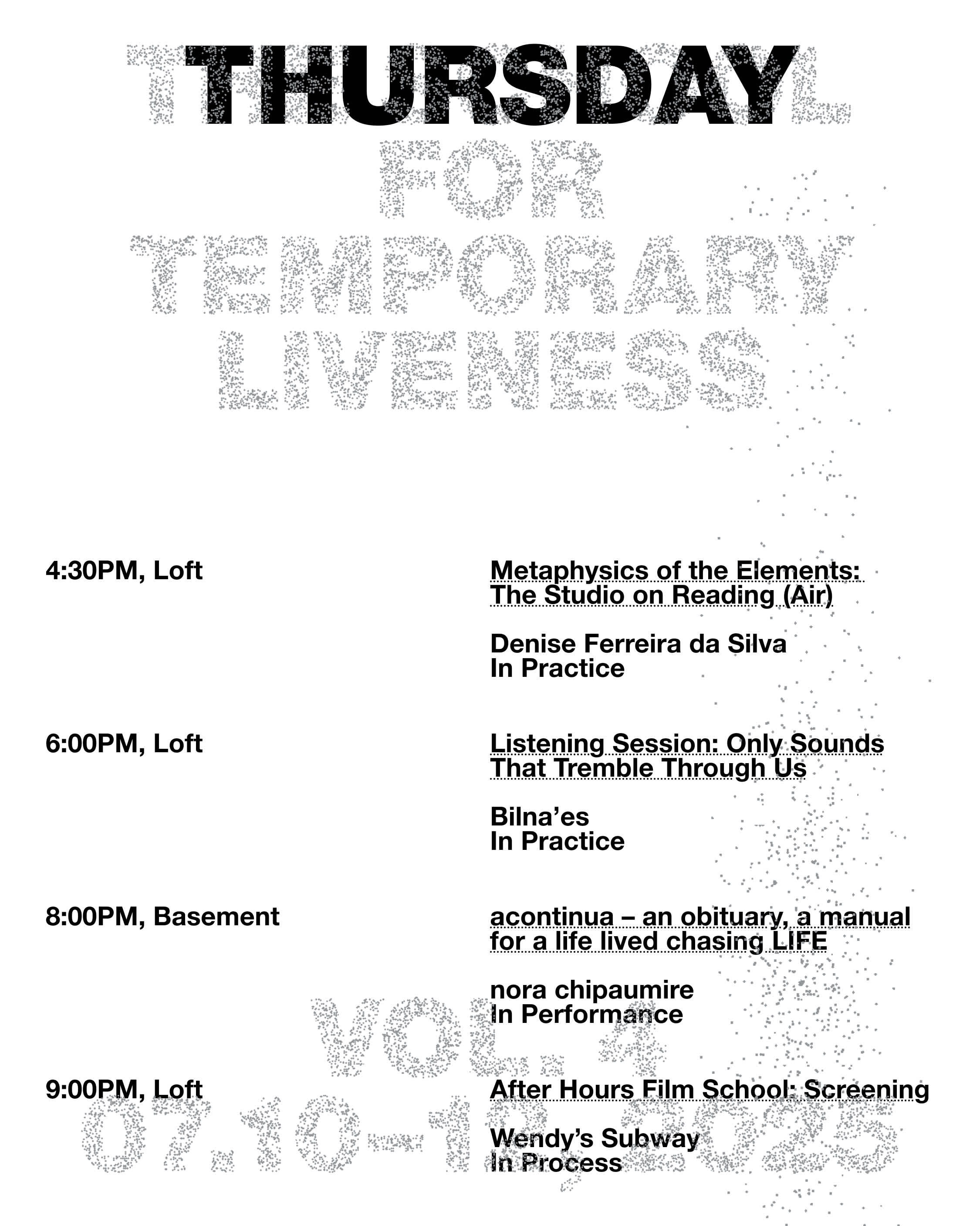 The School for Temporary Liveness (STL) invites you to join our beautifully improper and unwieldy assembly. Following three prior iterations, Vol. 4 continues STL’s proposal to reimagine performance through the poetic frame of a school. From Thursday July 10–Saturday July 12, STL Vol. 4 will inhabit The Kitchen at Westbeth, with live broadcasts on Montez Press Radio. Between air, earth, and rivers, spilling into and out of the LOFT and the BASEMENT, this impermanent campus hosts a series of situations for collective study and experiments in performance, practice, and pedagogy.