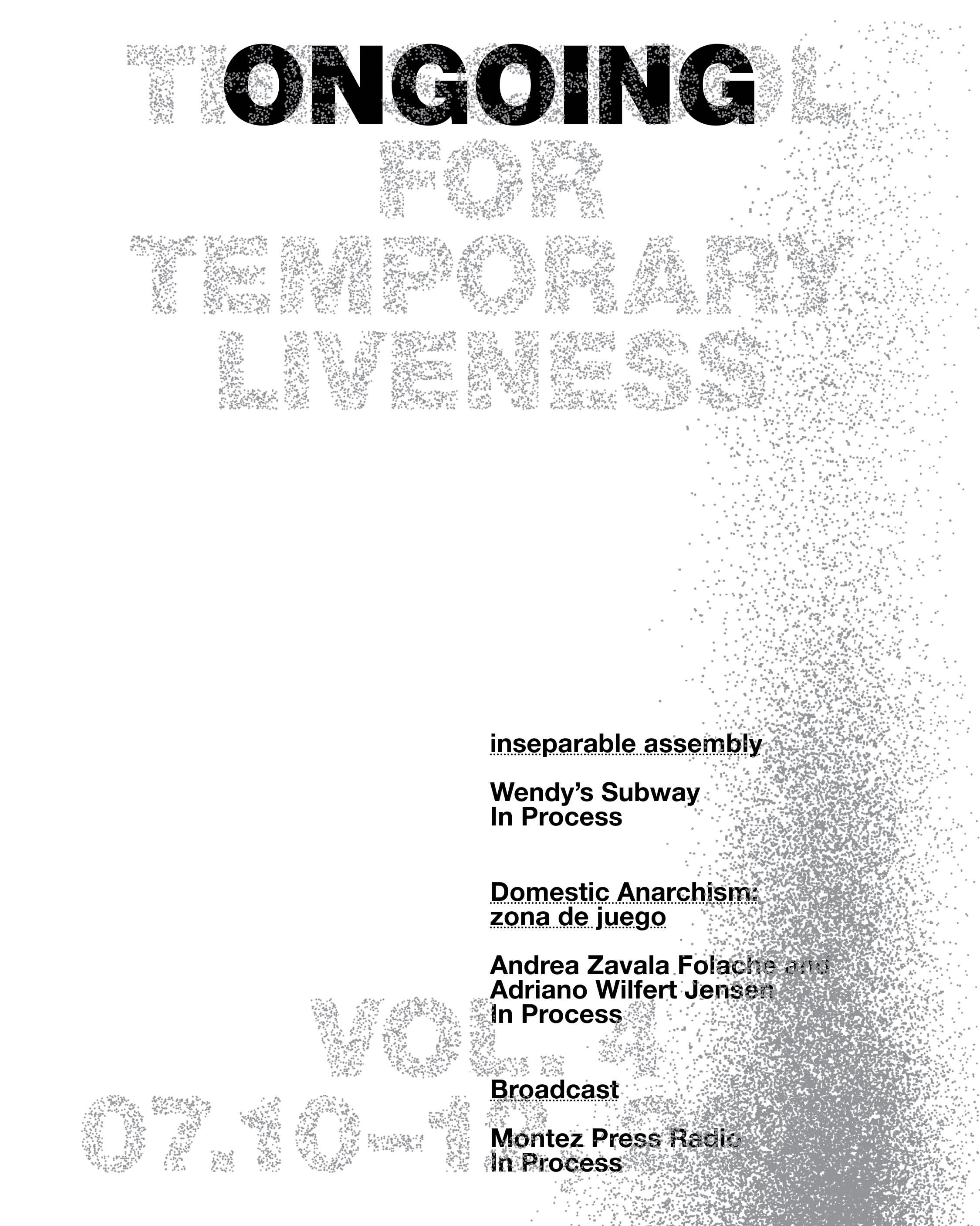 In process, we promiscuously accumulate, collide and (dis)arrange matters and materials in the Wendy’s Subway’s Reading Room, inseparable assembly, and in the zona de juego, a manifestation of Andrea Zavala Folache and Adriano Wilfert Jensen’s project Domestic Anarchism. inseparable assembly constellates a collection of texts that prompt connections and webs of thought. Through a screening program with the After Hours Film School, inseparable assembly attends to the many valences of rehearsal. Domestic Anarchism: zona de juego makes a place for ambient conviviality and cohabitation. Emerging from a series of intimate collaborations that blur living and making, the zona de juego and its companion session bailes with Malcolm-x Betts shapeshift between dancing, mark-making, ingesting, and reflecting.