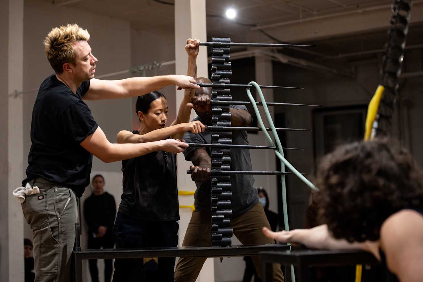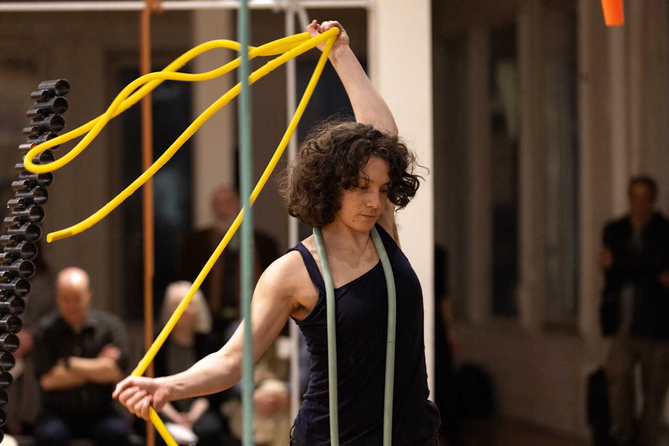 Working with industrial objects and materials such as rubber and metal, dancers activate sculptures in complex patterns, probing preconceptions of the material boundaries of the body.