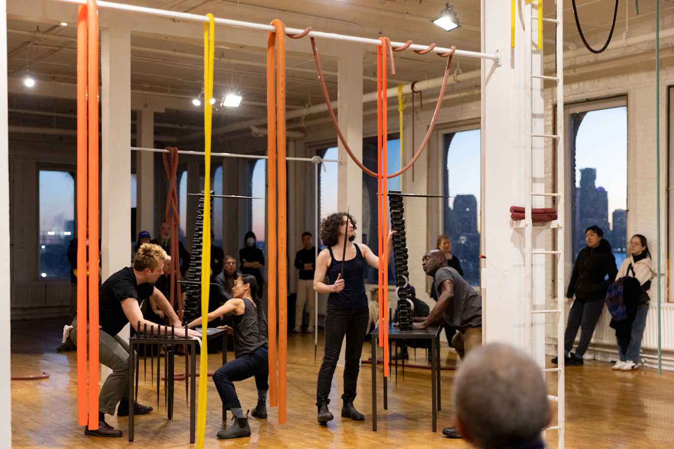 In this iteration, two towers of metal tubes are each capable of supporting metal spikes and rotating in place. Long, fleshy rubber ropes are inserted, spooled and twisted through the sculpture by dancers engaging with the objects and each other in a series of methodical tasks performed with workerly precision. The evolving patterns of action and design explore the tensions between work and product, danger and intimacy, absurdity and purpose, soft and hard, in and out. This serves to complicate expectations of clear, binary contrasts often raised in gendered conversations about physical bodies.